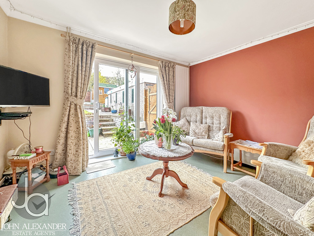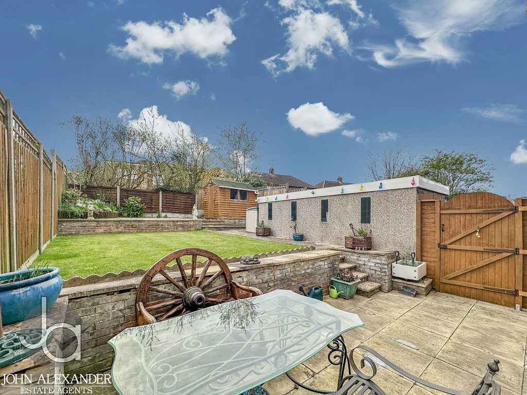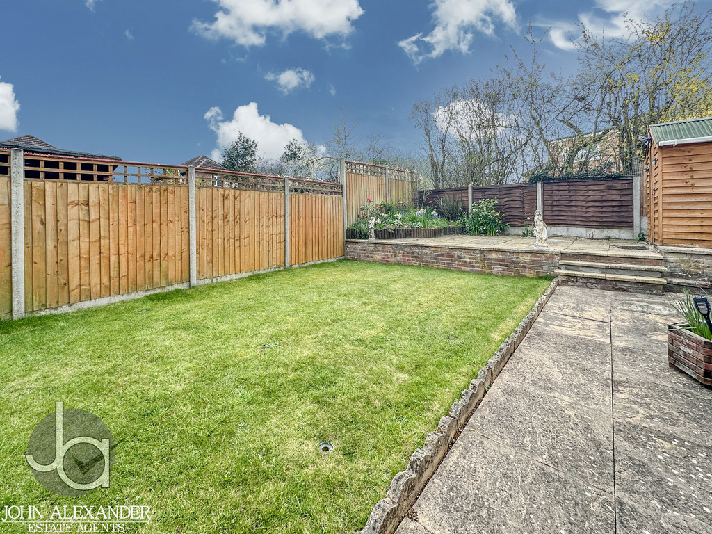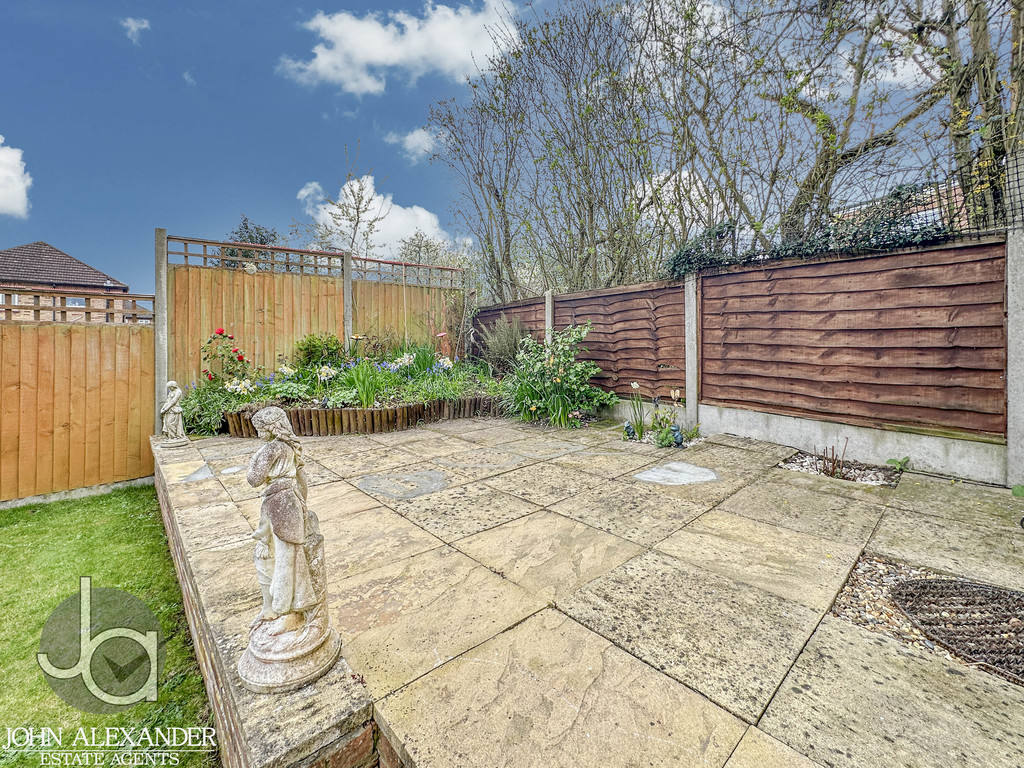 STEP OUTSIDE The completely secluded, low maintenance south west facing rear garden offers a peaceful retreat with a lower patio, neat lawn, raised planted borders with garden lighting, water butts, and a powered 8' x 6' shed, while the front garden is well kept with established shrubs, complemented by a long block paved driveway for two cars, a frost free outside tap with hose, and a locked side gate leading to the detached garage. The garage itself is a versatile, well maintained pebble dash prefab structure featuring four windows for natural light, a recently renewed roof with a five year guarantee (two years remaining), internal lighting, power sockets, storage cupboards, a sturdy workbench ideal for DIY or storage, and practical double wooden barn doors.