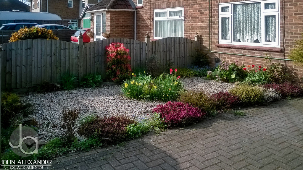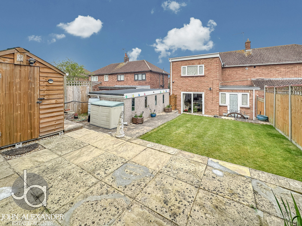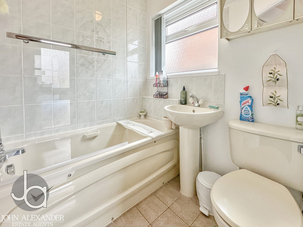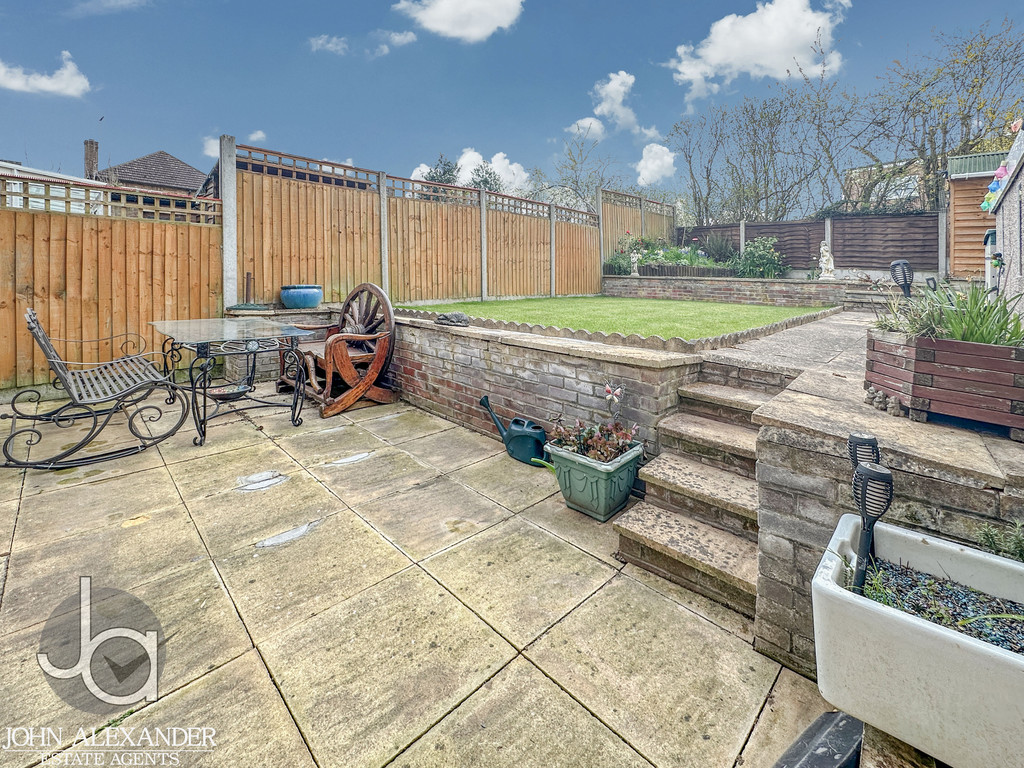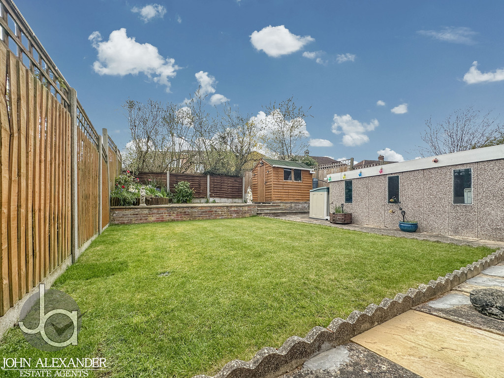 STEP OUTSIDE The completely secluded, low maintenance south west facing rear garden offers a peaceful retreat with a lower patio, neat lawn, raised planted borders with garden lighting, water butts, and a powered 8' x 6' shed, while the front garden is well kept with established shrubs, complemented by a long block paved driveway for two cars, a frost free outside tap with hose, and a locked side gate leading to the detached garage. The garage itself is a versatile, well maintained pebble dash prefab structure featuring four windows for natural light, a recently renewed roof with a five year guarantee (two years remaining), internal lighting, power sockets, storage cupboards, a sturdy workbench ideal for DIY or storage, and practical double wooden barn doors.