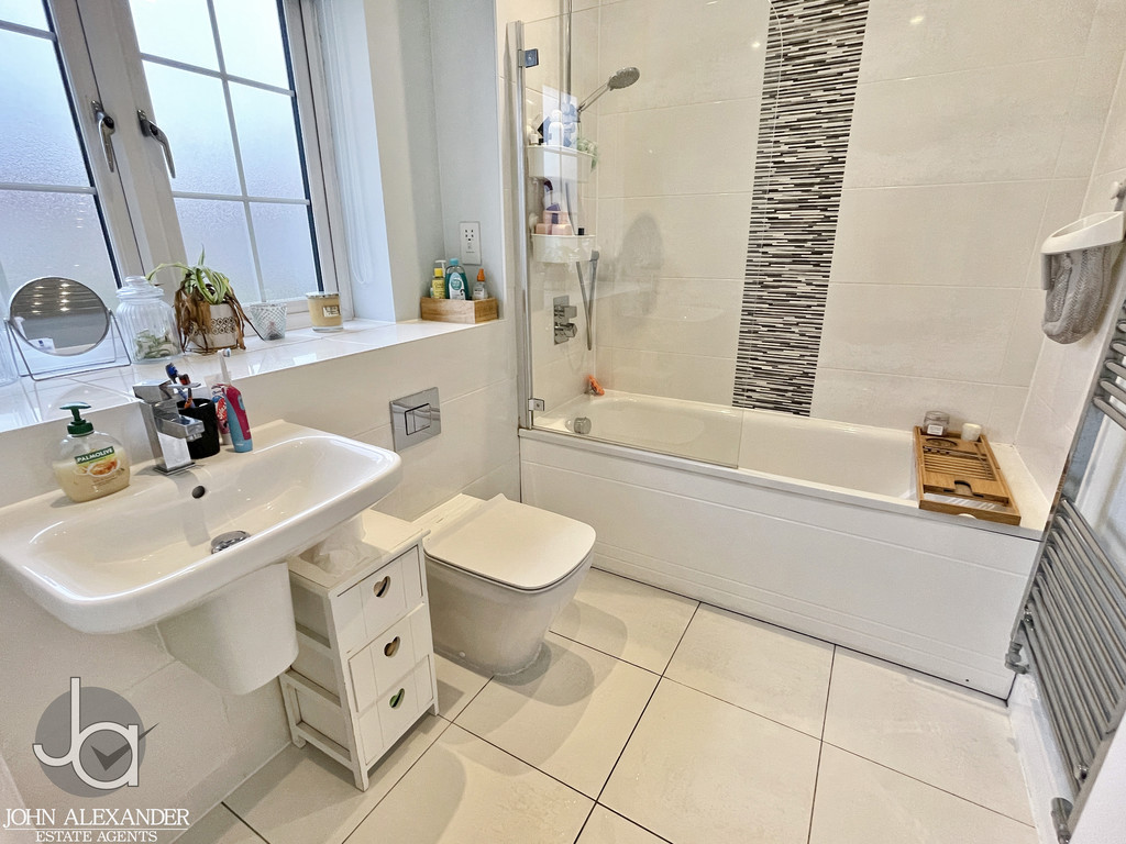 BATHROOM White suite comprising of panelled bath with shower above and guard, wash basin, low level WC, chrome heated towel rail, down lighters to ceiling, extractor fan, obscure double glazed window to front.