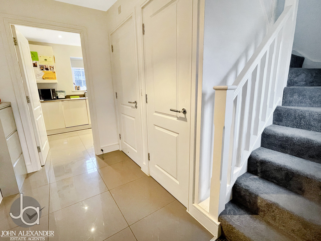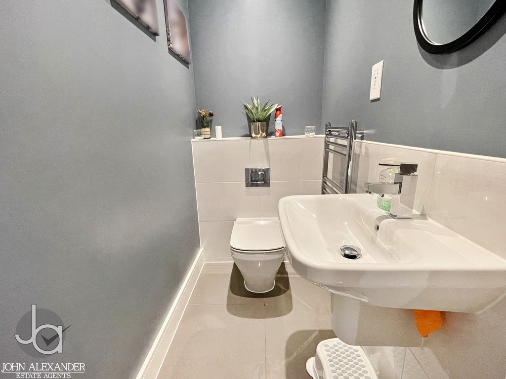 CLOAKROOM Low level WC, wash basin, chrome heated towel rail, down lighters to ceiling, extractor fan.