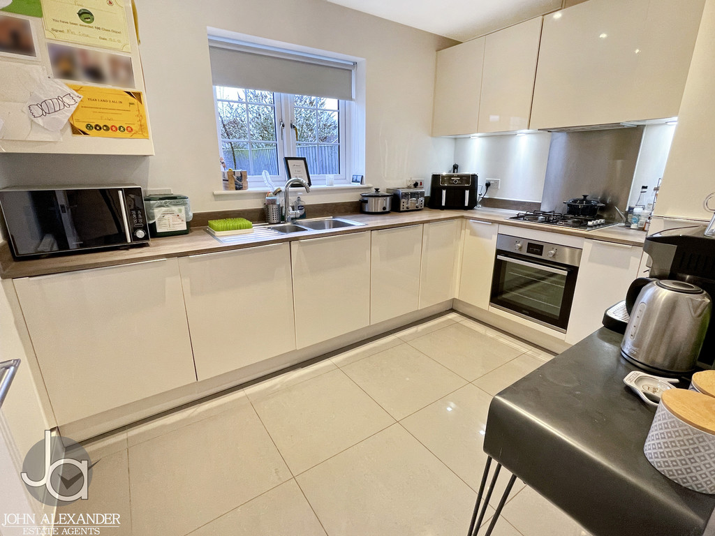 KITCHEN 11' 0" x 8' 4" (3.35m x 2.54m) Stainless steel one and a half bowl single drainer sink unit with cupboards under, matching base and eye level cupboards, integrated dishwasher, washing machine, fridge freezer, built in oven, hob and extractor fan, downlighters to ceiling, wall mounted gas boiler, radiator, double glazed window to rear.