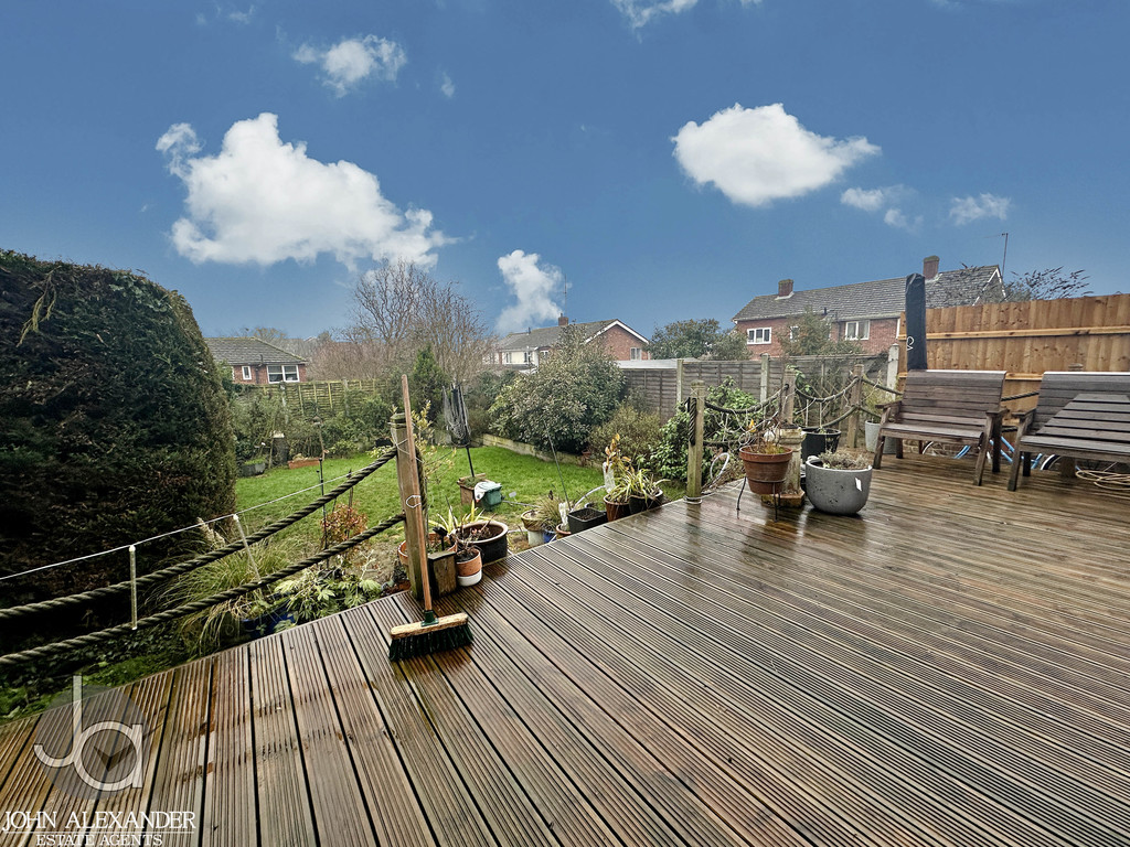 STEP OUTSIDE The property enjoys a substantial and well established rear garden, offering an excellent degree of privacy and a superb space for outdoor living. Directly adjoining the house is an attractive raised decked terrace, ideal for al fresco dining and entertaining, with ample room for seating. From here, steps lead down to a generous lawned area, bordered by mature shrubs, trees and neatly maintained hedging that creates a secluded and peaceful setting.