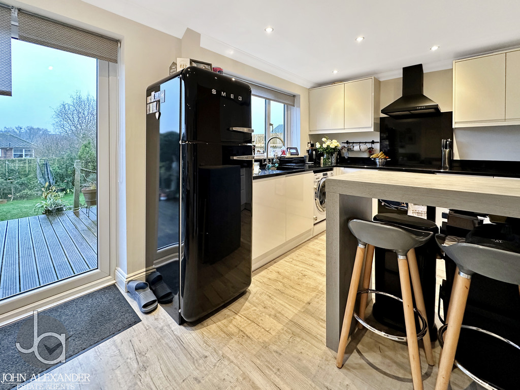 From the living room, the home flows beautifully into the contemporary kitchen/diner, sized 5.26m x 2.41m (17'3" x 7'11"). The kitchen boasts sleek gloss cabinetry paired with smart black roll top worktops, along with an integrated hob, oven, and extractor fan. A stylish breakfast bar adds casual seating and extra workspace, while the room also offers ample space for a dining table, making it a fantastic social hub for cooking, dining, and entertaining.