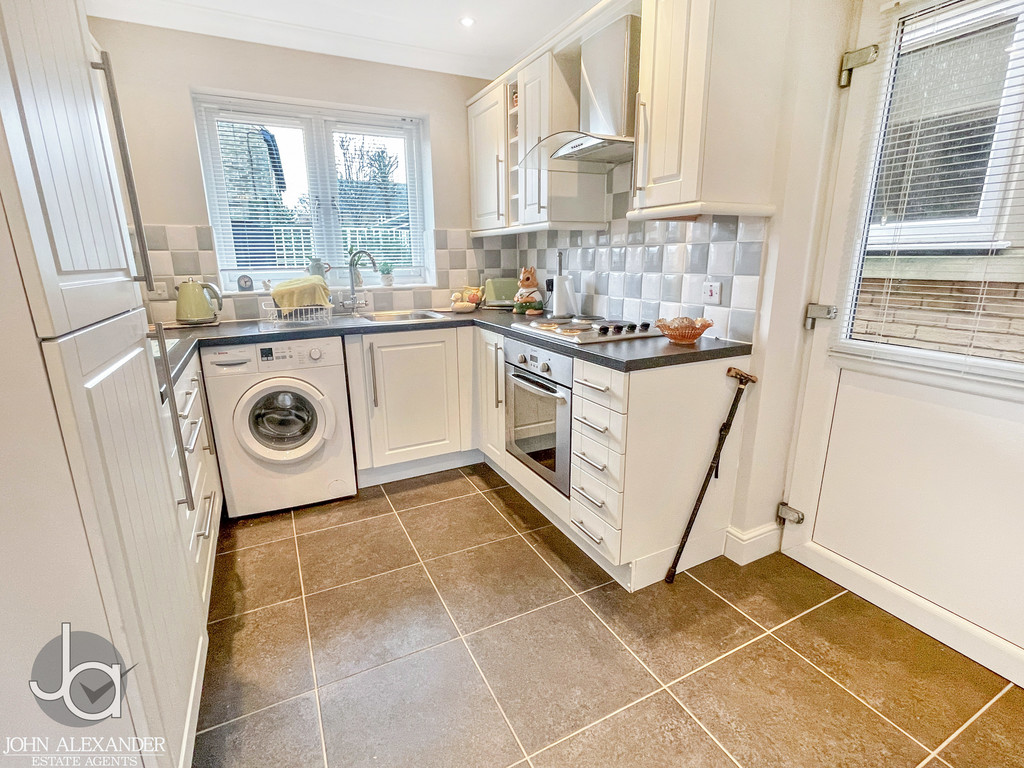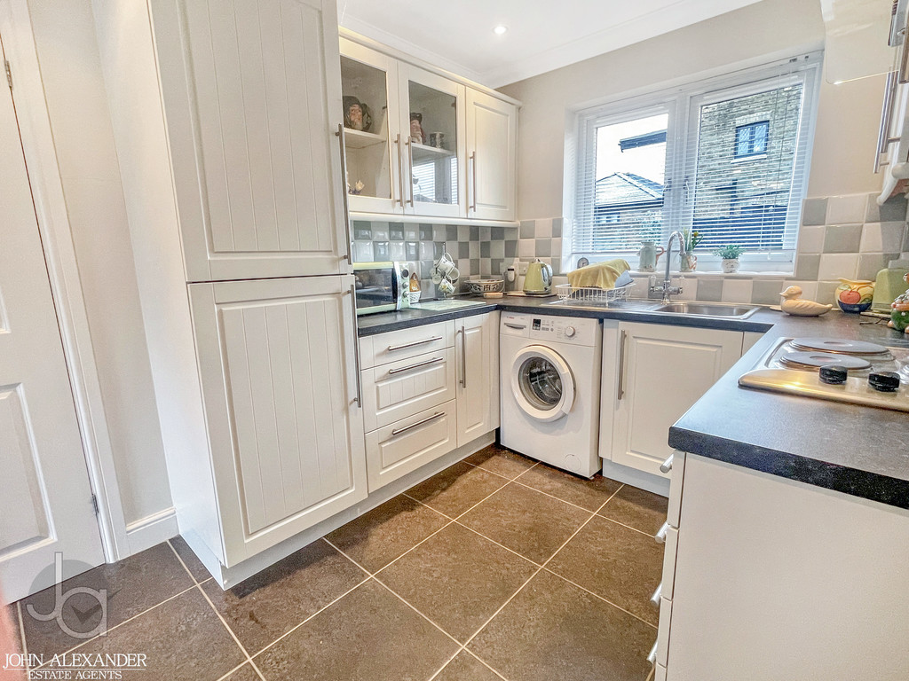 KITCHEN 9' 9" x 8' 0" (2.97m x 2.44m) Stainless steel single bowl and drainer sink unit with cupboards under, matching base and eye level cupboards, roll top work surfaces, integrated fridge freezer, oven, hob and extractor fan, space for washing machine, built in cupboard housing gas boiler, radiator, double glazed window to front.