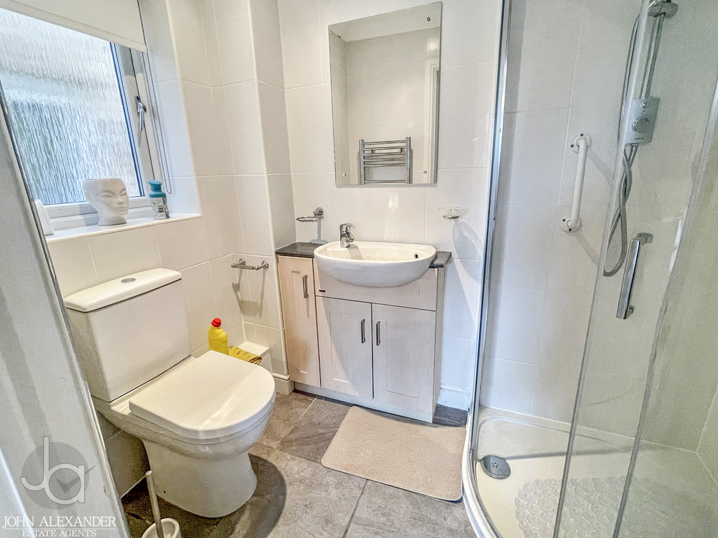 EN-SUITE SHOWER ROOM Corner shower, wash basin, low level WC, chrome heated towel rail, obscure double glazed window to side.