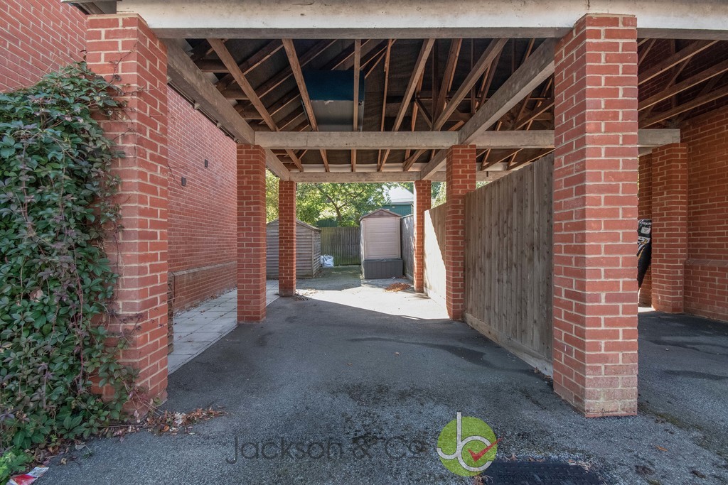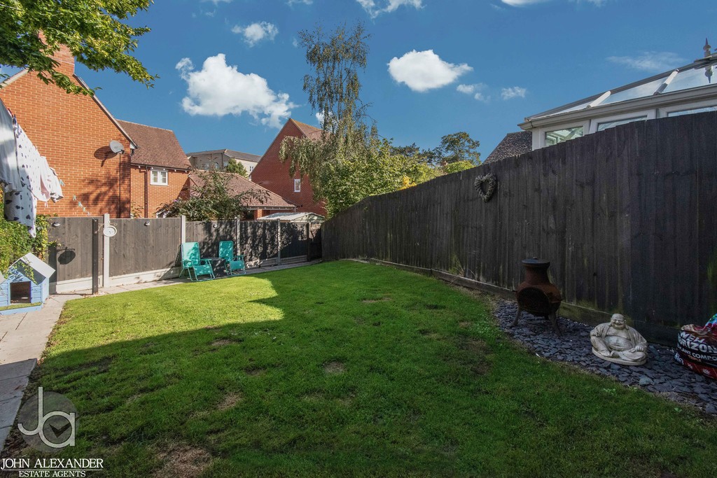 The rear garden mostly laid to lawn, patio steps leading down to 2 allocated parking spaces, side gate leading to front of the property, enclosed by solid brick wall and fencing.