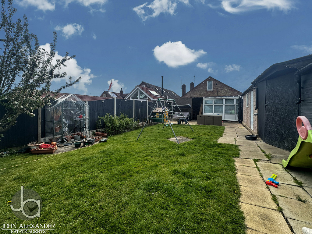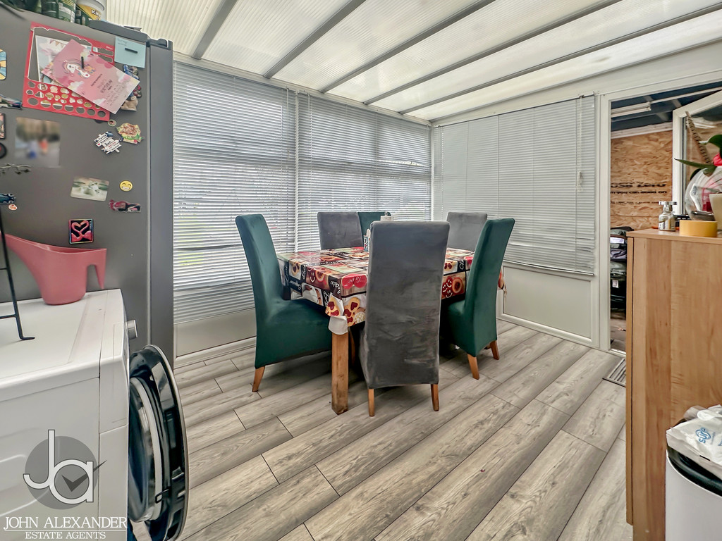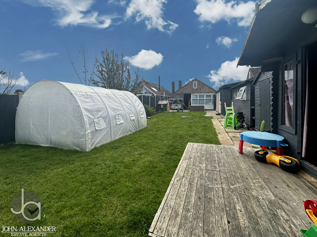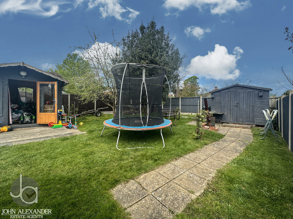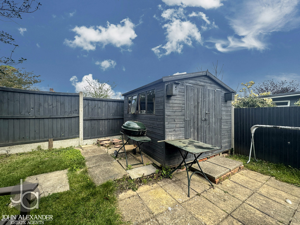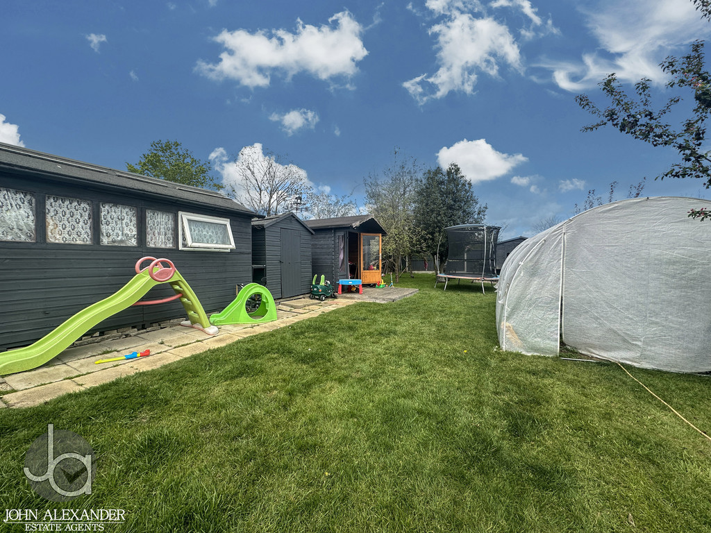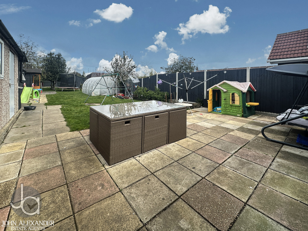 STEP OUTSIDE A spacious, well kept garden featuring a large patio ideal for entertaining, opening onto a generous lawn. The garden includes a greenhouse, shed, and garden room, providing excellent versatility and storage, and is fully enclosed for privacy with new fence panels. To the front, the property also benefits from a private driveway offering parking for several vehicles.
