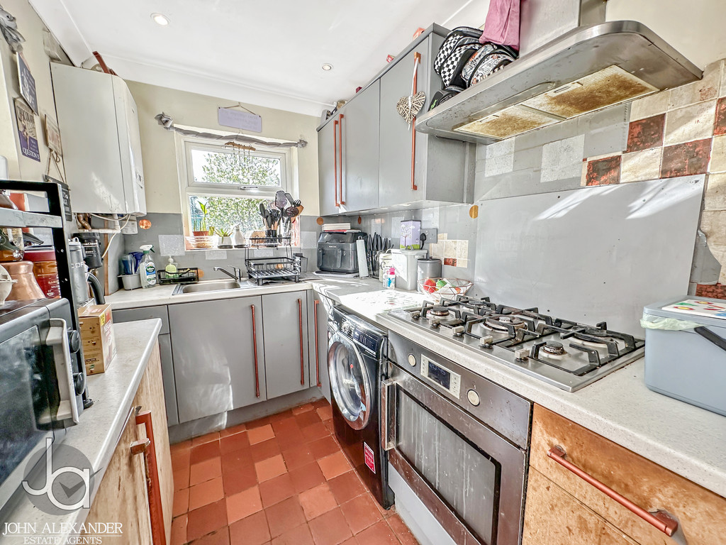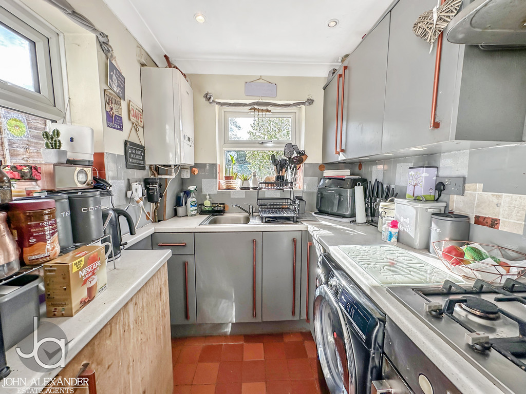 The kitchen is positioned at the rear of the property and measures approximately 11'1" x 5'1". It is fitted with a range of base and eye-level units with matching drawers, tiled flooring and tiled walls. There is space for a fridge/freezer, a sink with drainer and mixer tap, an extractor hood, and a wall-mounted gas boiler. Double-glazed windows face the rear and side aspects, and a door provides access to the garden.