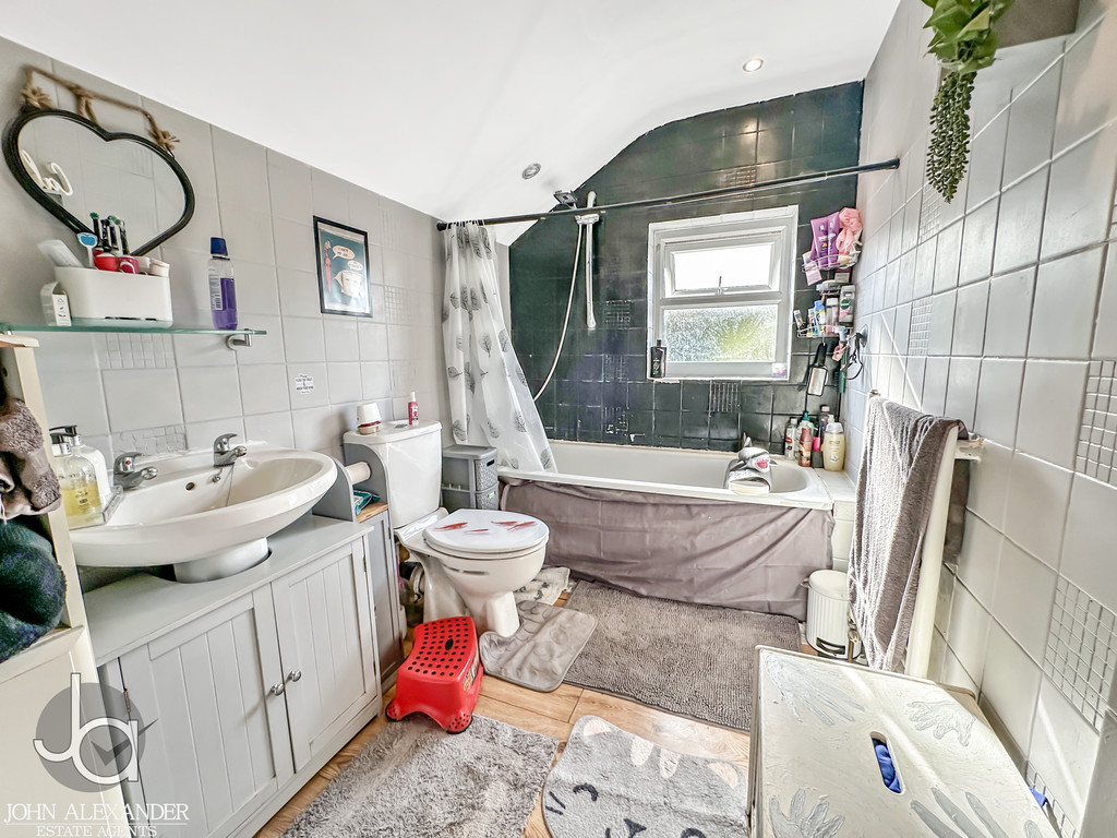 The family bathroom comprises a panelled bath with overhead shower, low-level WC, pedestal wash hand basin. The room has tiled walls, a radiator, and an obscure double-glazed window to the rear.