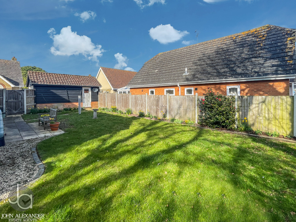 OUTSIDE Side access to rear garden which is laid to lawn, patio area, outside lighting, shed to remain, flower and shrub boarders, enclosed by fencing.