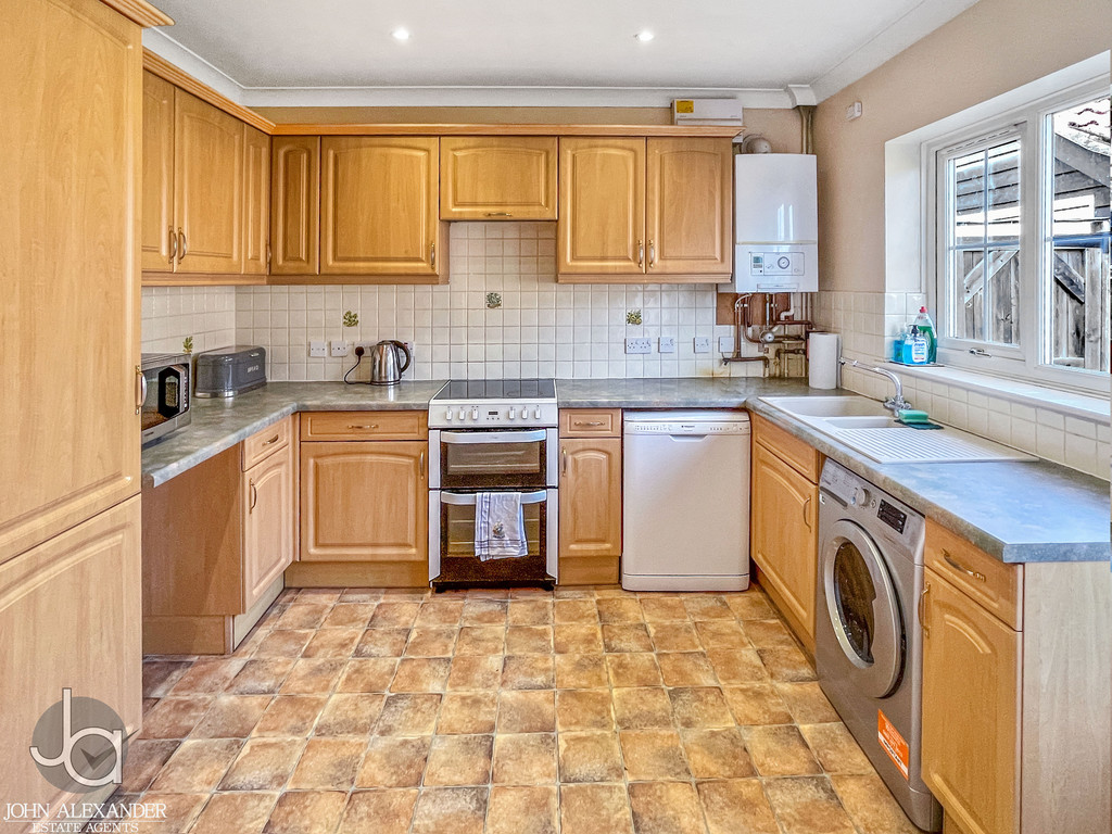 KITCHEN/BREAKFAST ROOM 12' 4" x 10' 8" (3.76m x 3.25m) One and a half bowl single drainer sink unit with cupboards under, matching base and eye level cupboards, roll top work surfaces, space for dishwasher, washing machine and cooker to remain with extractor above, wall mounted gas boiler, space for fridge freezer, radiator, double glazed window and door to rear garden, down lighters to ceiling.