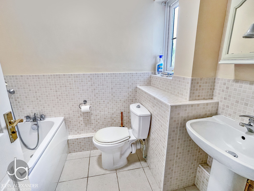 BATHROOM White suite comprising of panelled bath, low level WC, pedestal wash basin, radiator, extractor fan, obscure double glazed window.
