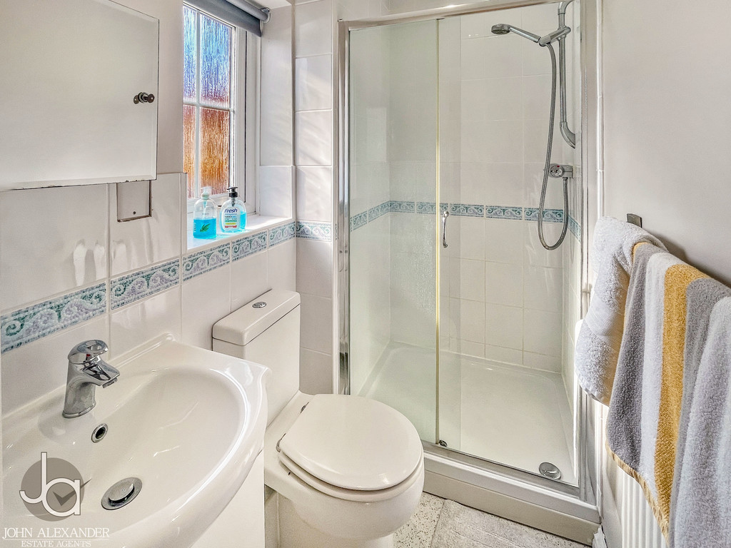 EN-SUITE SHOWER ROOM Double shower, low level WC, wash basin, radiator, obscure double glazed window to front, down lighters to ceiling, extractor fan.