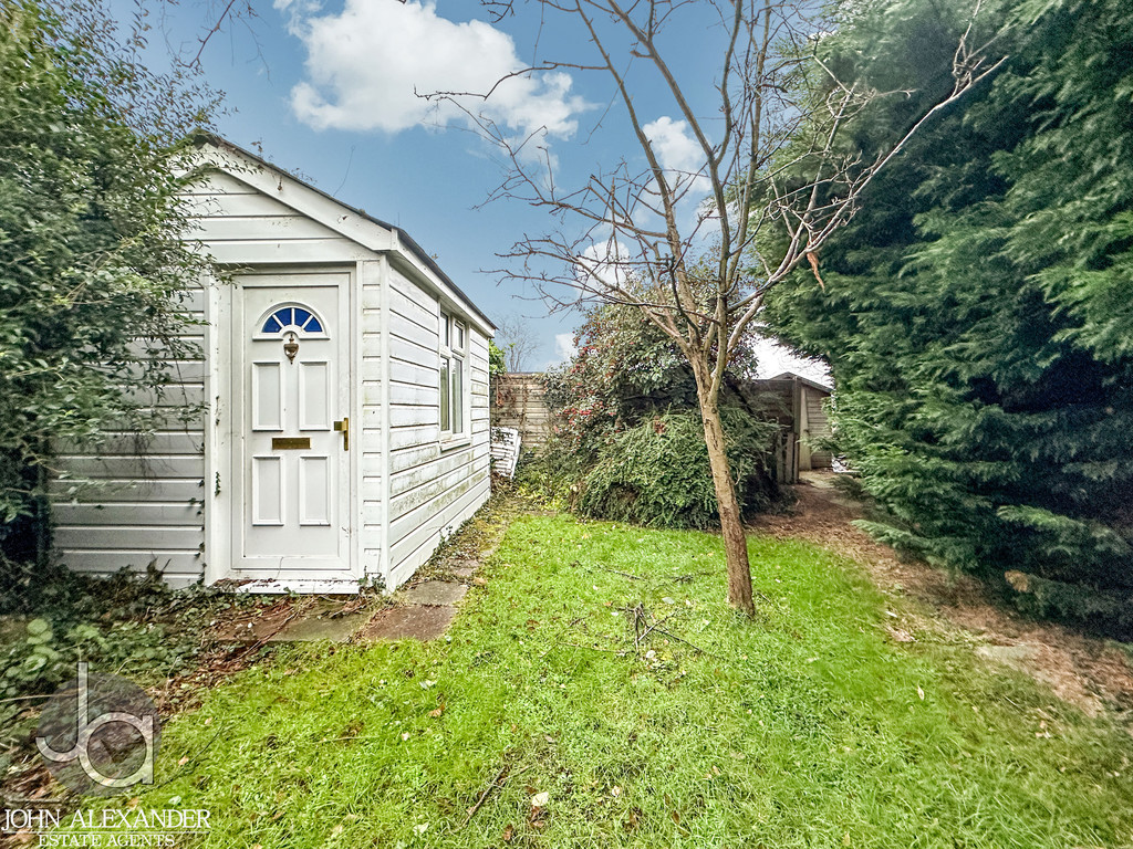 STEP OUTSIDE The property includes a double garage with an up-and-over door, also accessible from the hallway, and fitted with power and lighting. The rear garden is fully enclosed and features patio areas, a lawn bordered by mature shrubs, and an outbuilding understood to have power and light. At the front, a block-paved driveway offers additional parking and leads to the garage, complemented by flower beds and a mature tree.