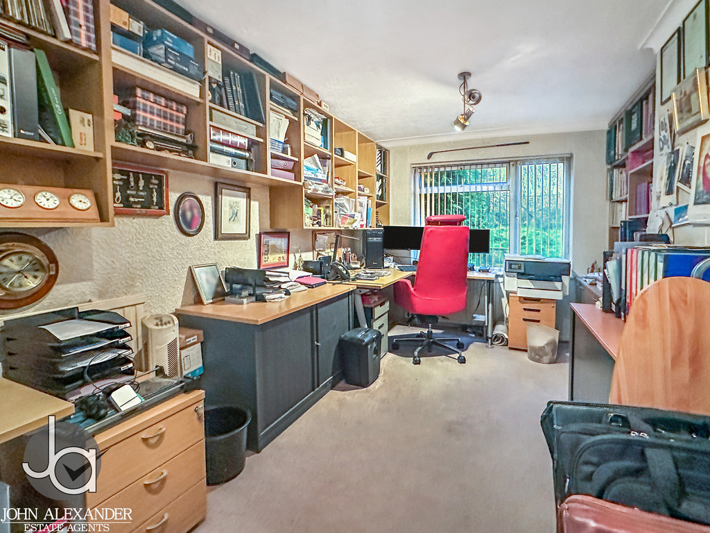 Adjacent to the lounge is a versatile study or fourth bedroom (5m x 2.95m), perfect for those working from home or needing an additional guest room. This room benefits from French doors that open into the first of two conservatories.