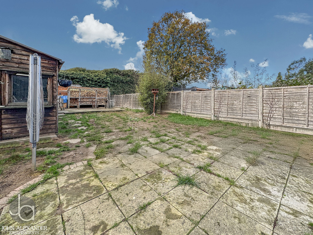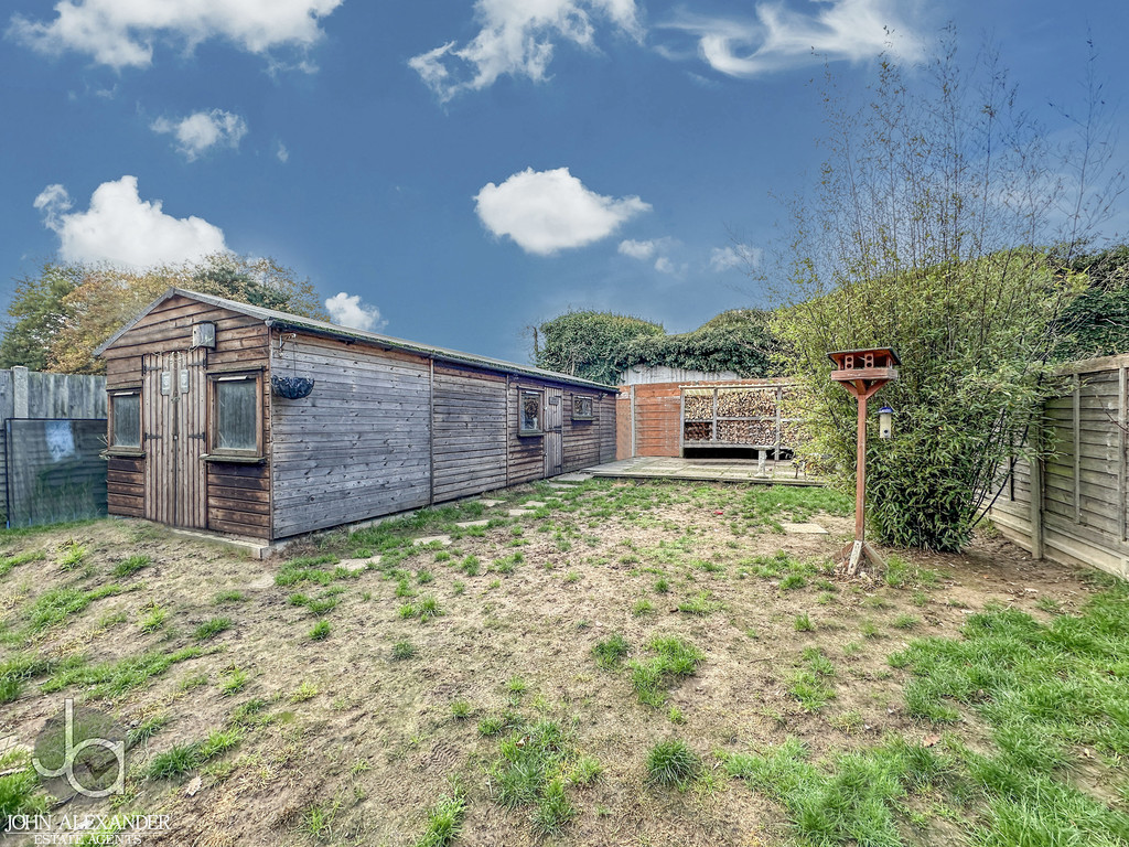 To the rear, there is a generous garden mainly laid to lawn, complemented by a patio area ideal for outdoor dining and relaxation. Additionally, a large wooden outbuilding offers versatile use, perfect as a workshop, home office, or storage space.