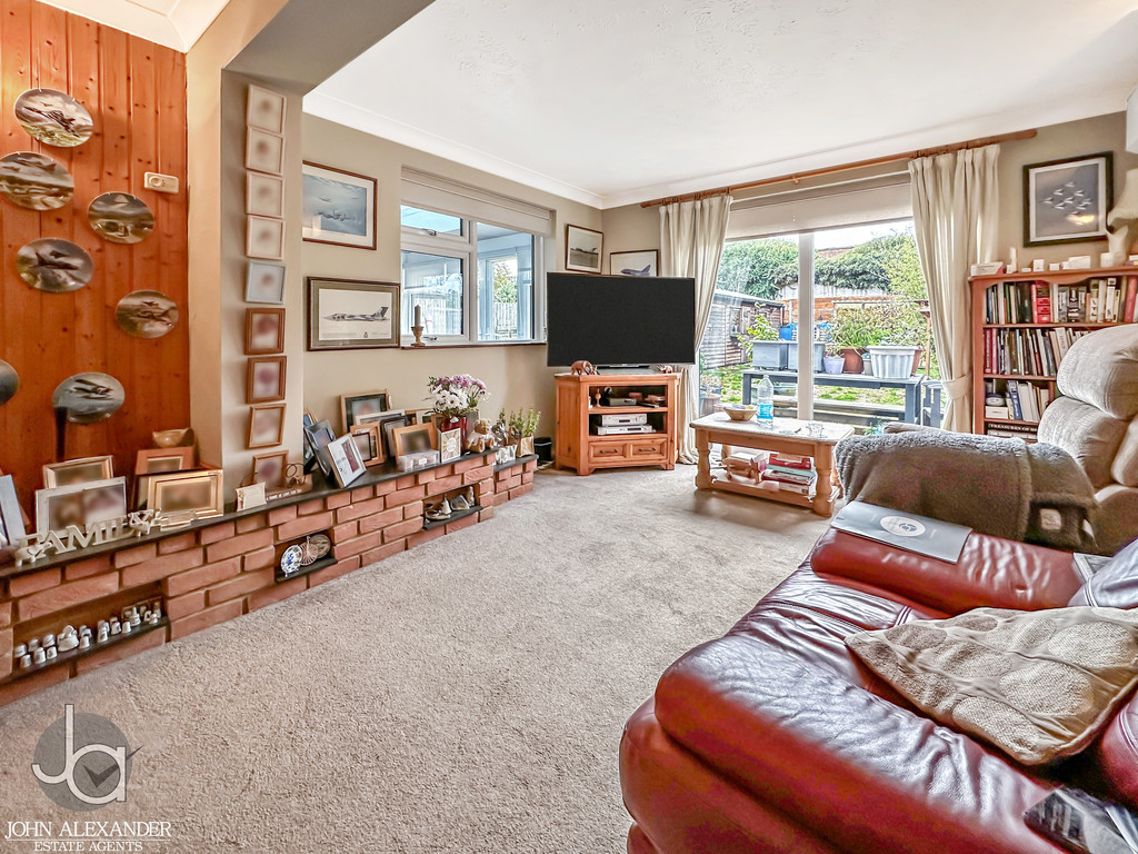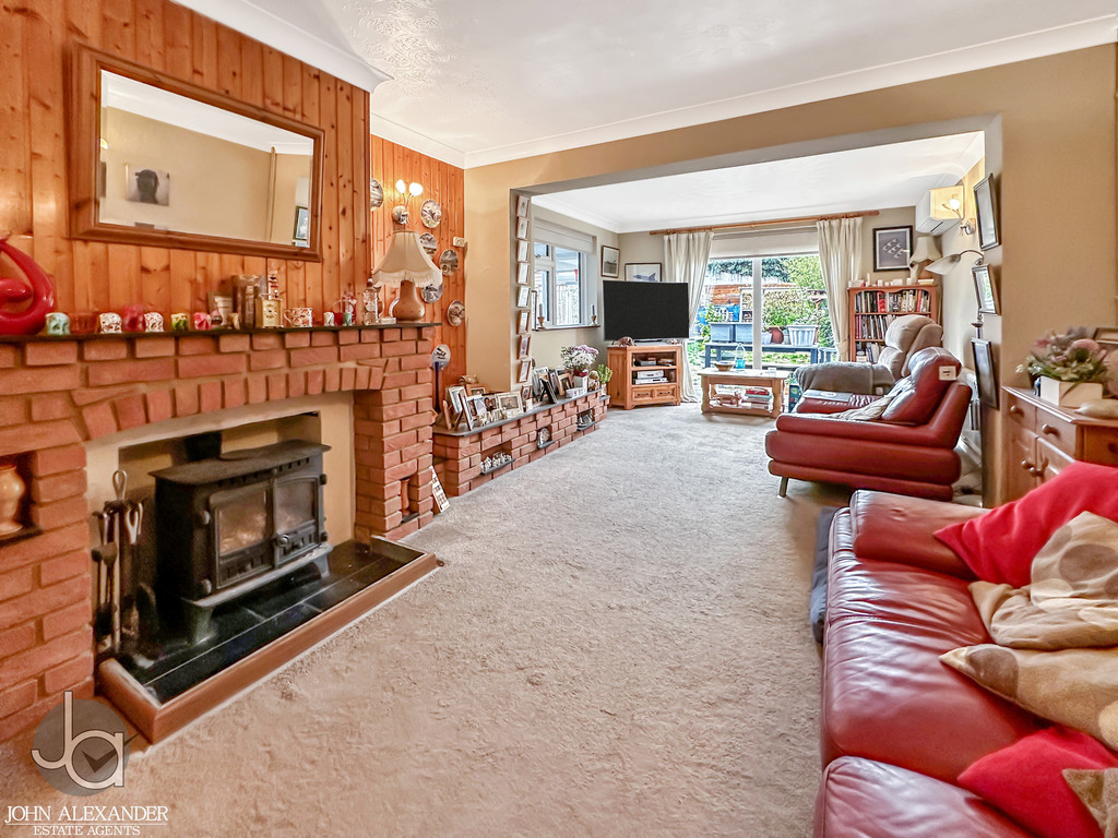 To the left, you'll find the impressive lounge, measuring 23.4ft x 12.2ft, a bright and spacious room featuring a charming brick fireplace with a log burner, perfect for cosy evenings. Large windows flood the space with natural light, creating an inviting atmosphere.