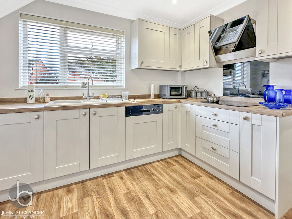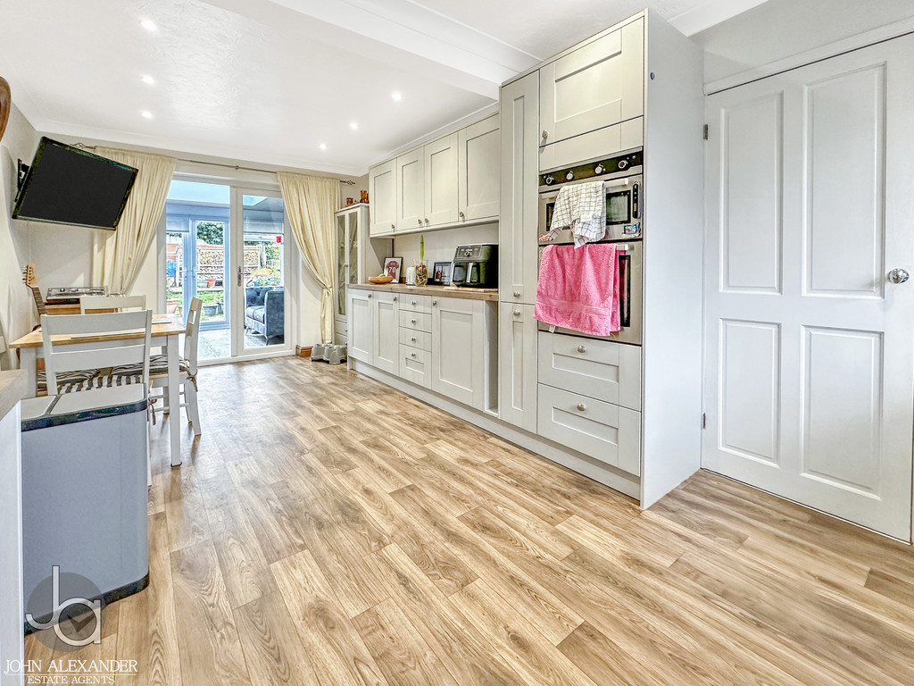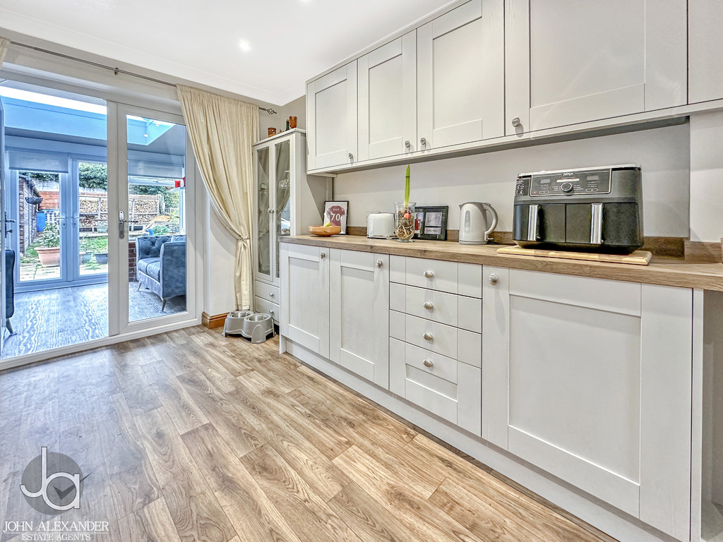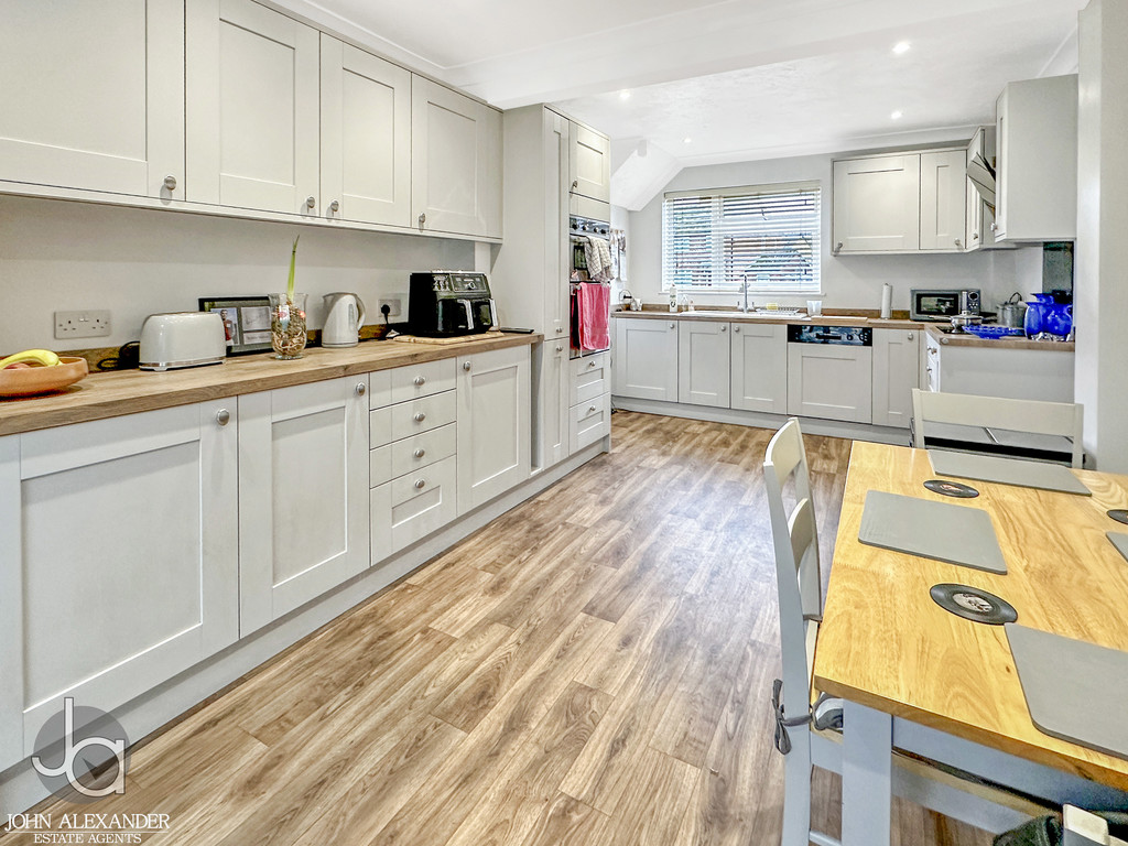 The heart of the home is the stunning kitchen/diner (19.9ft x 10.3ft), beautifully appointed with shaker-style cabinets, wood countertops, and complementary wood flooring. Integrated appliances add a sleek, modern touch, while the generous layout offers ample space for family dining and entertaining.