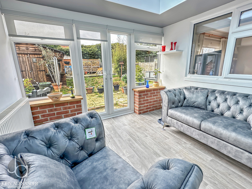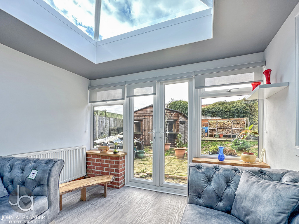 From the kitchen, step into the elegant sun room (10.4ft x 10ft), enhanced by a striking roof lantern, making this a light-filled space ideal for relaxing or enjoying garden views.