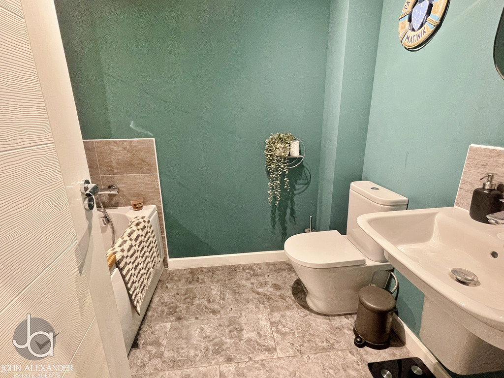 BATHROOM White suite comprising of panelled bath, low level WC, heated towel rail.