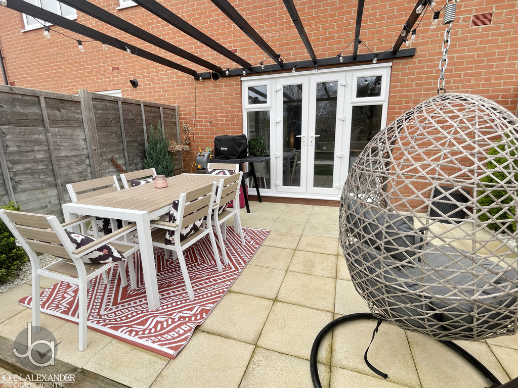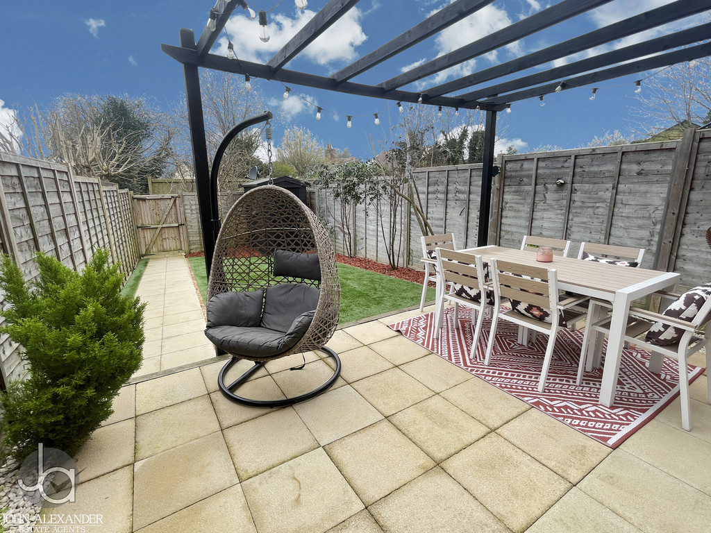 OUTSIDE Rear access to the garden which is laid with Astro Turf, patio area and pathway, pergola, shed to remain, enclosed by fencing.