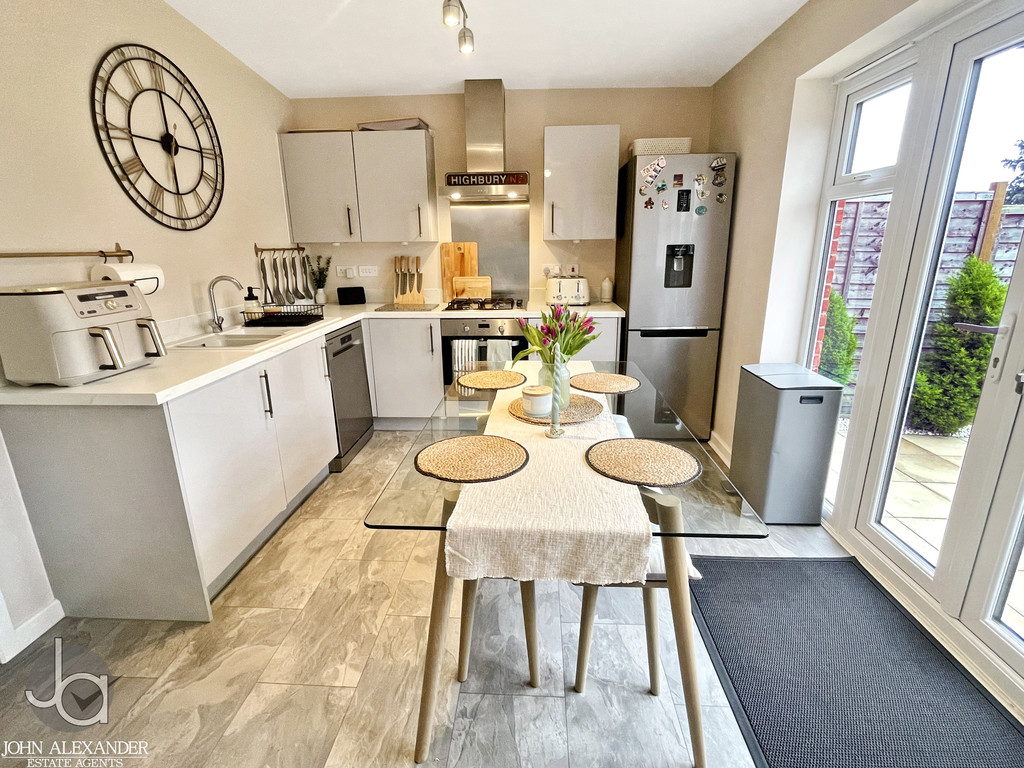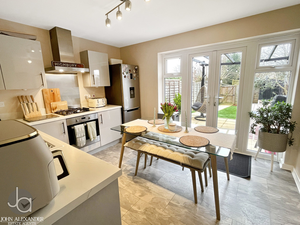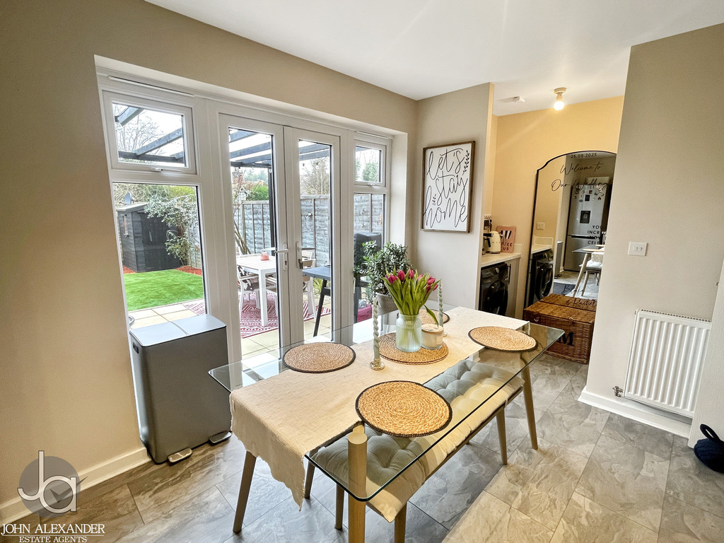 KITCHEN/DINER 12' 0" x 9' 9" (3.66m x 2.97m) One and a half bowl single drainer sink unit with cupboards under, matching base and eye level cupboards, roll top work surfaces, space for dishwasher and fridge freezer, integrated oven, hob and extractor fan, radiator, double glazed French doors and windows to rear.