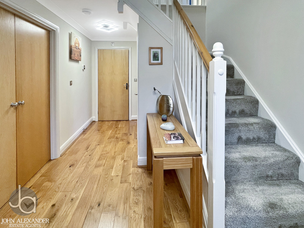 STEP INSIDE The property opens with a welcoming entrance hall featuring oak flooring and a useful storage cupboard, along with a convenient cloakroom with fitted vanity storage.