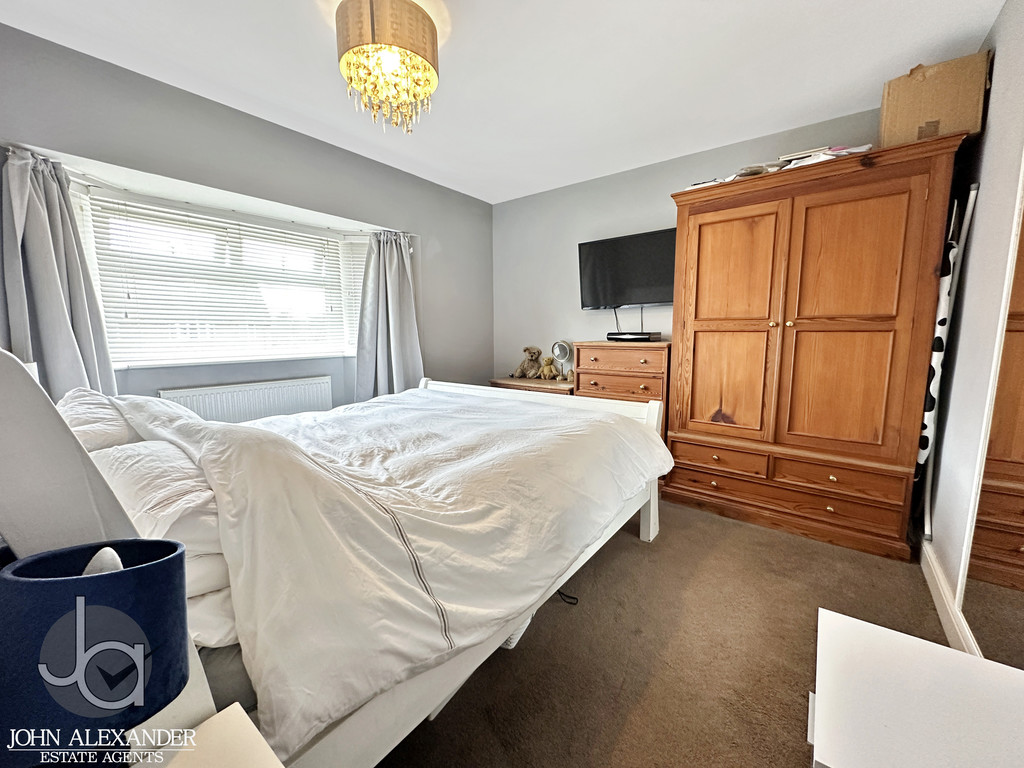 From the main hallway, stairs lead to the first floor where a bright landing connects three bedrooms and a family bathroom. The first of the larger bedrooms sits to the front, measuring 4.30m x 3.33m (14'1" x 10'11"), and includes a bay window echoing the style of the lounge below. The second double bedroom, positioned centrally, measures 4.30m x 3.29m (14'1" x 10'10"), offering another spacious and well proportioned room.