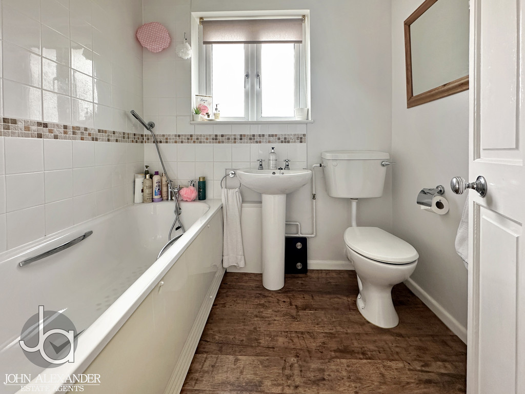 The third bedroom, located at the rear, measures 2.81m x 2.32m (9'3" x 7'7") and is suitable as a single bedroom, nursery, or dedicated study. The first floor also features a built in cupboard along the landing (CBD). Completing the layout is the family bathroom, fitted with a bath, WC, wash basin, and window for ventilation.