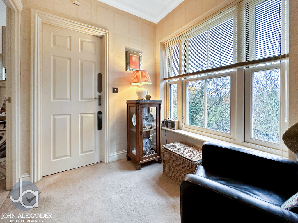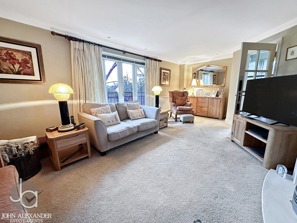 Stairs rise to the first floor, where the landing leads to the spacious lounge measuring 20'9" x 11'7", featuring French doors opening onto a private balcony and a charming feature fireplace, as well as an additional bedroom measuring 12'2" x 9'5", ideal as a guest room, study, or nursery.