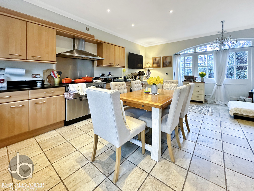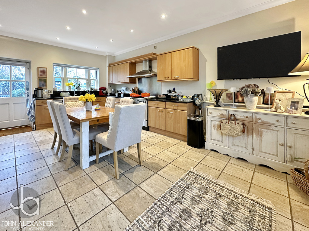 STEP INSIDE Upon entering, the welcoming entrance hallway leads through to the impressive ground floor kitchen/diner measuring 21' x 16'11", a bright and social space fitted with wood cabinetry, worktops, a stainless steel sink and drainer with mixer tap, a Rangemaster range cooker with cooker hood and extractor fan, and ample room for appliances, alongside plenty of space for dining furniture and a sofa. Completing the ground floor is a cloakroom measuring 7'6" x 3'10".