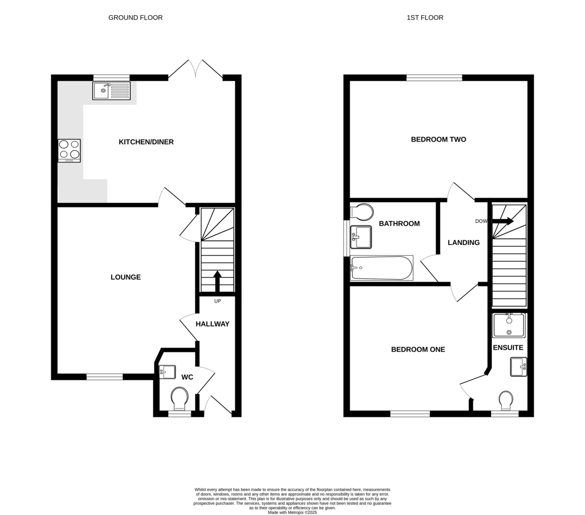 Upstairs, the landing connects to two bedrooms and the family bathroom. Bedroom One measures 10'8" x 9'7" with access to a stylish en-suite with a single shower cubicle, low-level WC, wash hand basin. Bedroom Two is a generous 13'10" x 7'0"