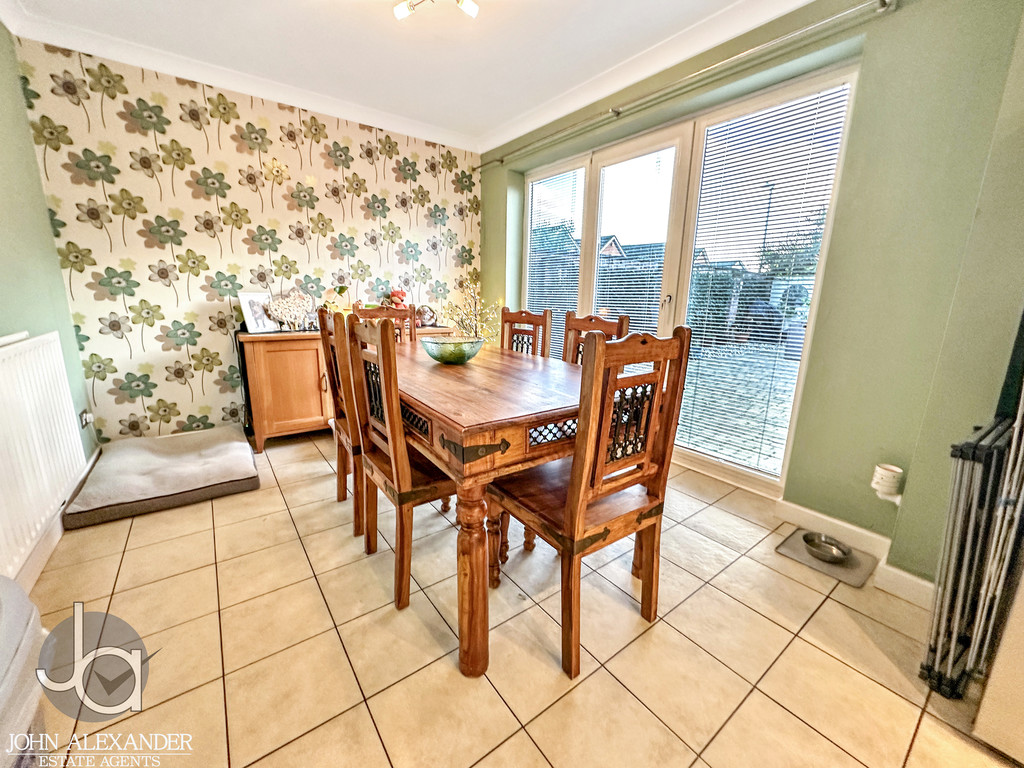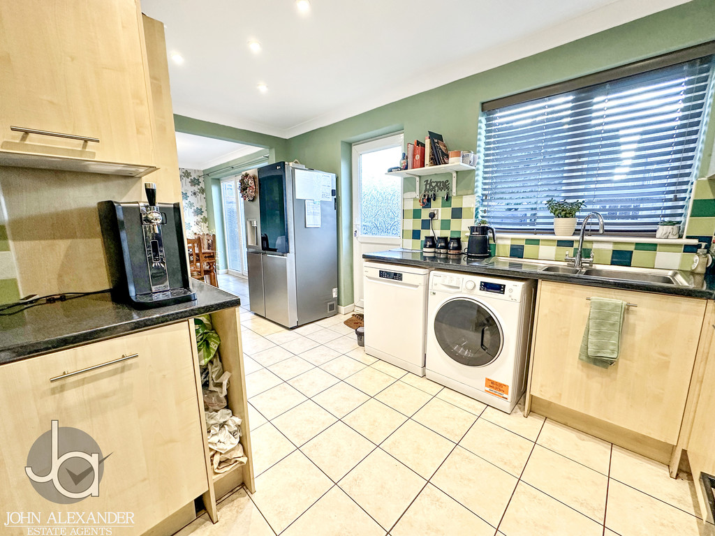 The rear of the property opens into a generous kitchen/diner (approx. 7.6m x 3.2m), thoughtfully designed for busy family routines and social gatherings. It features a comprehensive range of wall and base units, modern worktops, and an inset stainless steel sink/drainer. There is ample space for a double oven, washing machine, and a large fridge freezer. The layout easily accommodates a full-sized dining table, making it a sociable hub for meals and entertaining.