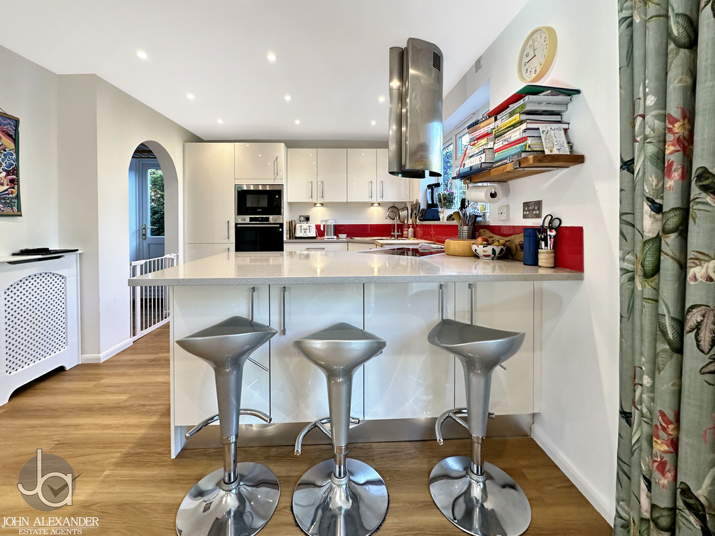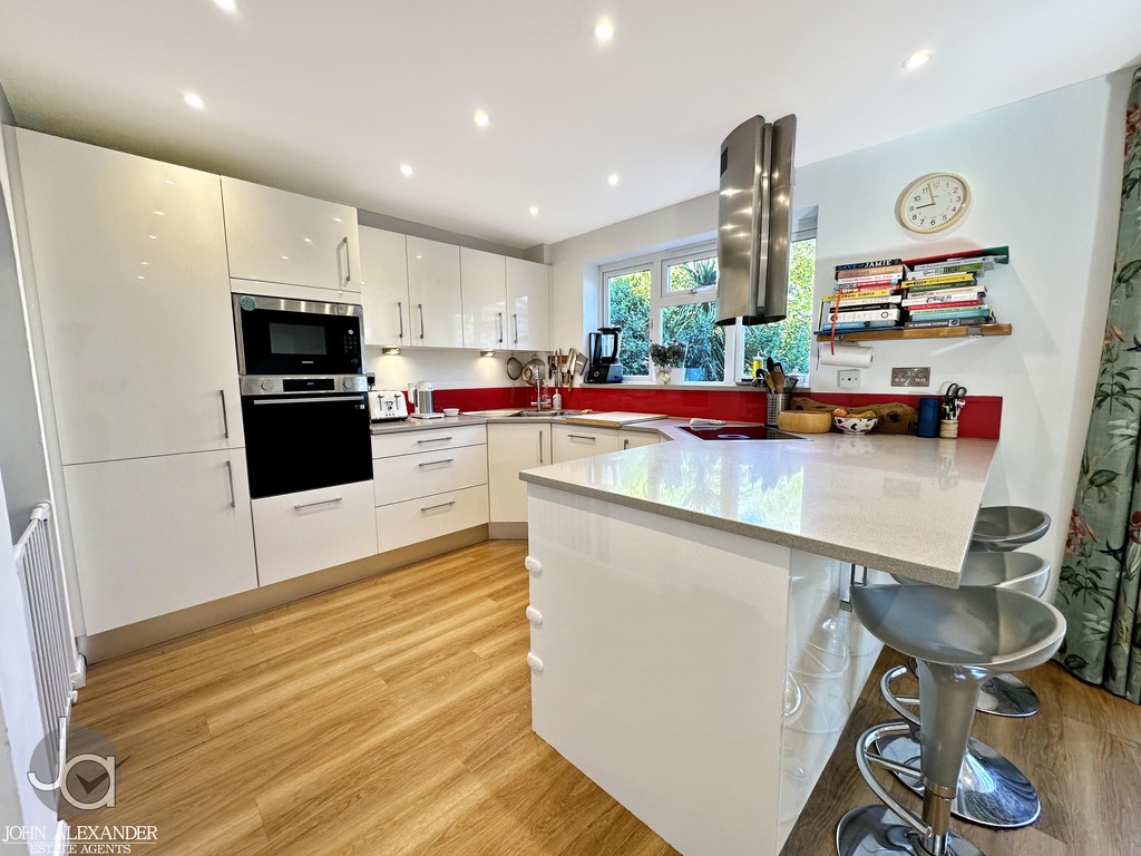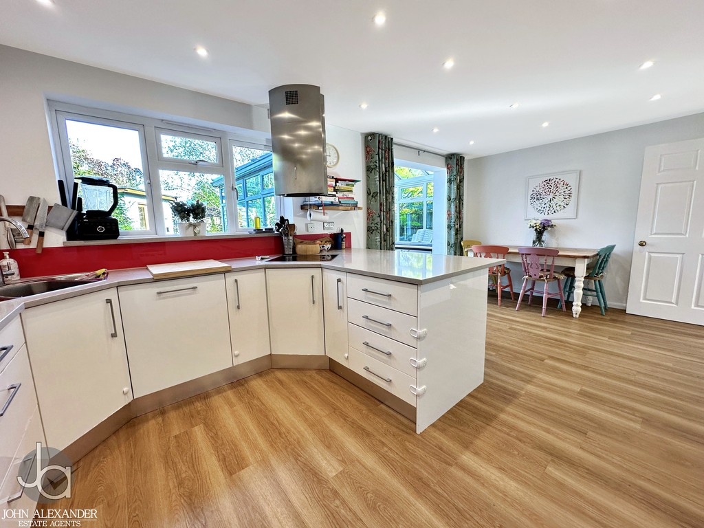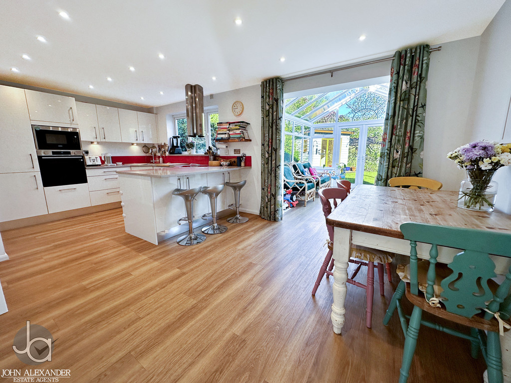The heart of the home is the impressive kitchen/diner, measuring approximately 19 ft 7 in x 10 ft 7 in. This contemporary space is fitted with modern high‑gloss cabinetry, matching work surfaces, integrated appliances, and a breakfast bar ideal for casual dining. A red splashback adds a striking contrast. The kitchen/diner flows seamlessly into the conservatory, creating an excellent sociable and family‑friendly layout.