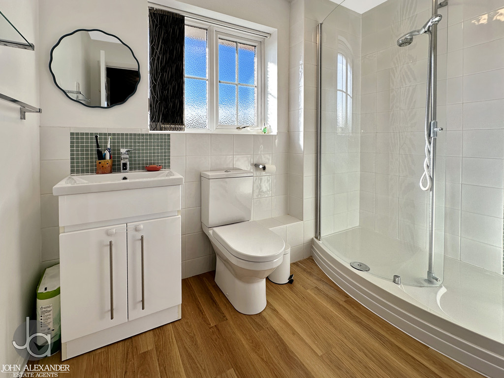 To the first floor, the accommodation continues to impress. The master bedroom is of generous proportions, measuring approximately 11 ft 8 in x 18 ft 11 in, and benefits from a stunning contemporary wet‑room en suite. Bedroom two measures approximately 11 ft 4 in x 10 ft 1 in and also enjoys its own modern en‑suite shower room. Bedroom three measures approximately 12 ft 6 in x 9 ft 7 in and provides further comfortable accommodation, benefiting from built‑in cupboards.