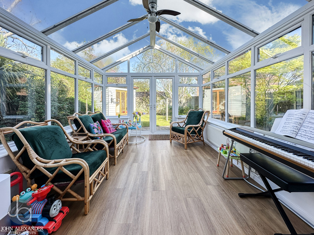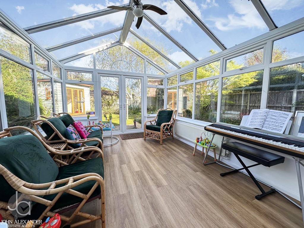 The conservatory, measuring approximately 10 ft 11 in x 6 ft 11 in, is a bright and airy addition to the home and enjoys attractive views over the garden. French doors open directly onto the garden, enhancing the connection between indoor and outdoor living.