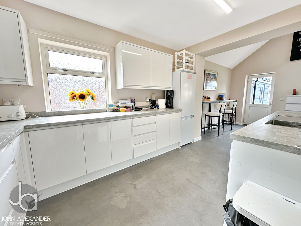 The modern kitchen features sleek white cabinetry, providing ample storage and worktop space, while large windows ensure the room is equally bright and airy. The kitchen flows seamlessly into a dining area, which offers direct access to the garden.