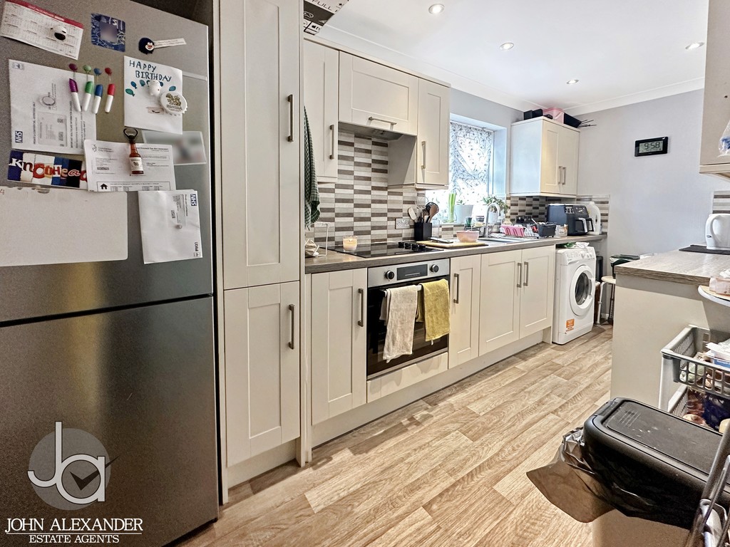 The impressively sized kitchen, at 16' 9" x 6' 1" (5.11m x 1.85m), is fitted with stylish shaker style cabinetry paired with generous work surfaces. This practical and contemporary kitchen includes a built in four ring ceramic hob, electric oven, plumbing for a washing machine, ample wall mounted storage units, and space for a fridge/freezer-providing everything needed for efficient day to day living.