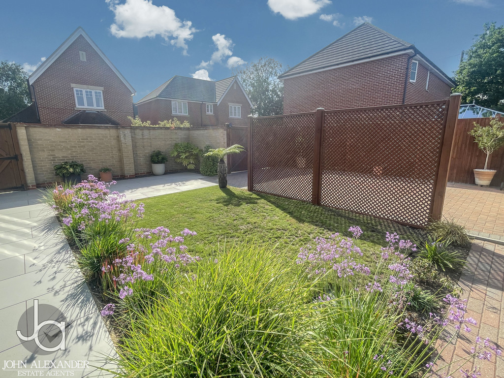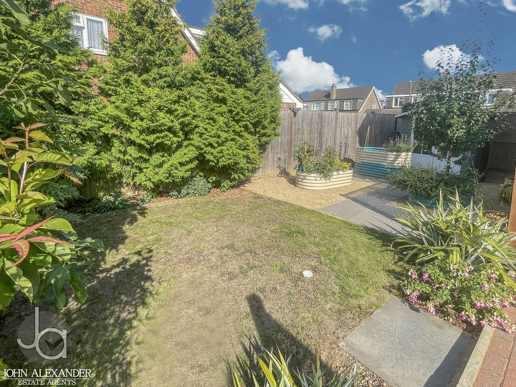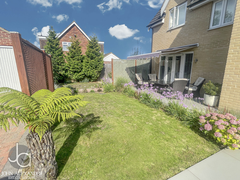 OUTSIDE The rear garden is landscaped with porcelain tiled patio with the garden being laid to lawn, flowers and shrubs, outside tap and lighting, awning over patio, side garden with vegetable patch and summer house.