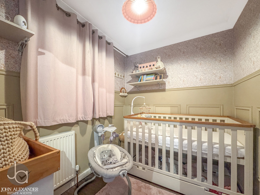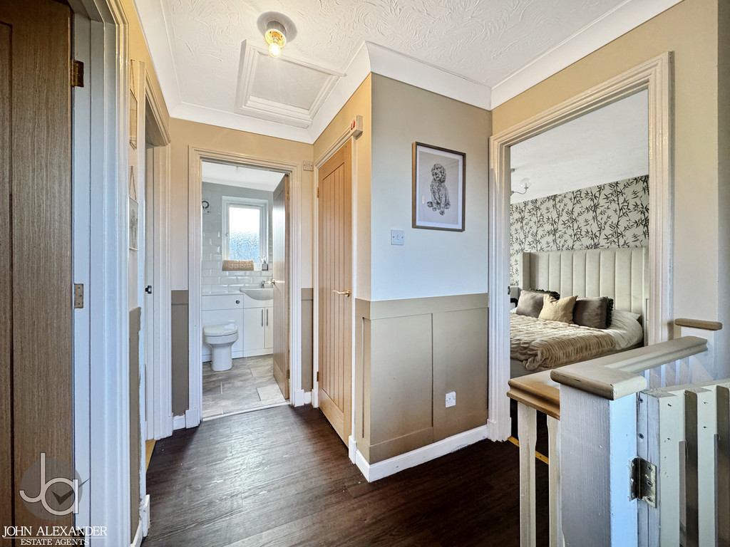 The first floor offers three generously sized bedrooms, complemented by a well-appointed family bathroom featuring a bath with an overhead shower.