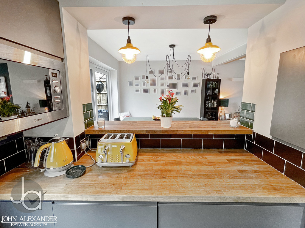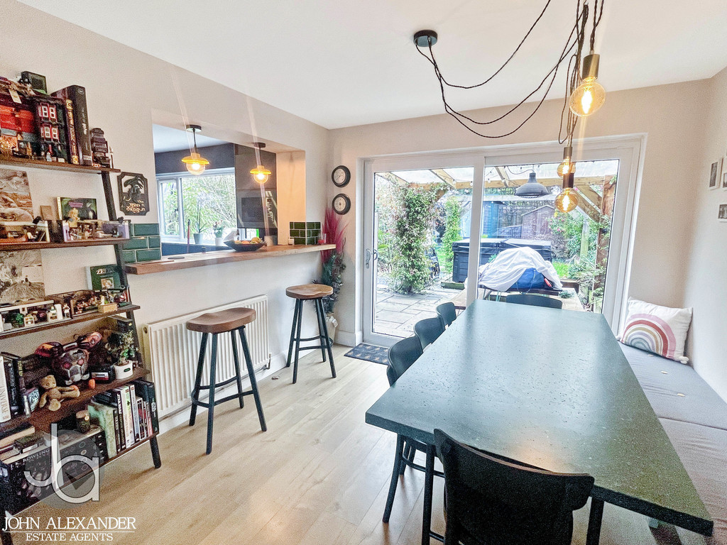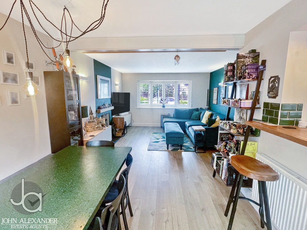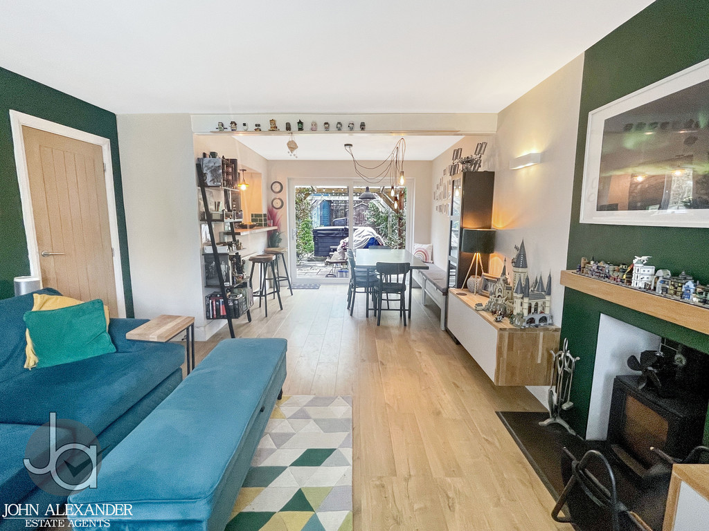 The kitchen flows seamlessly into the expansive open plan living and dining area, an inviting space measuring 6.8m x 3.7m (22'4" x 12'3"). This beautifully bright room features a breakfast bar, a log burner for cosy evenings, and generous space for an eight seater dining table. Sliding patio doors from the dining area lead directly to the covered garden terrace, creating a superb indoor outdoor connection perfect for entertaining.