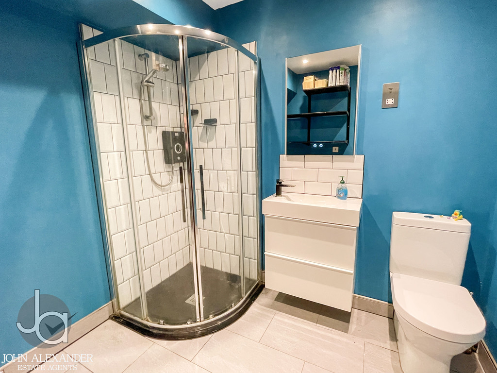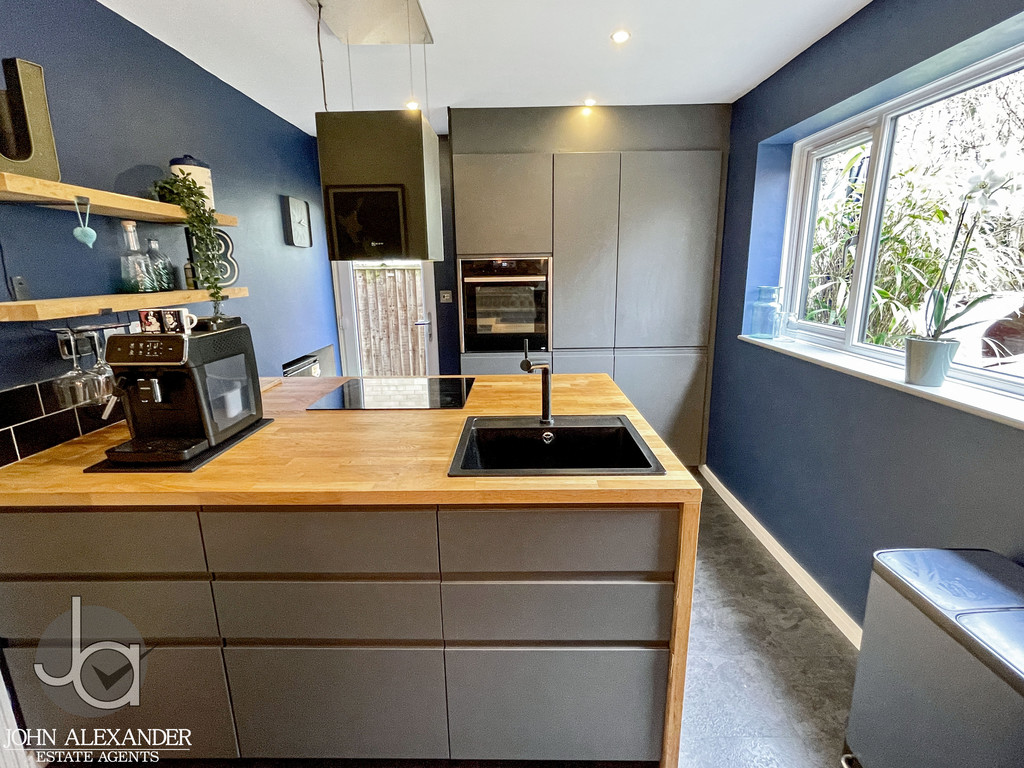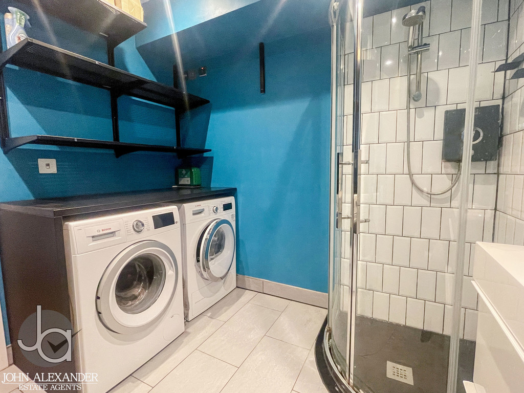 Continuing along the hallway, you will find the spacious utility and shower room, measuring 2.3m x 2.4m (7'8" x 7'11"), fitted with a practical walk in shower and WC. At the end of the hall, the door opens into the contemporary kitchen, updated in 2020, and designed with sleek, clean line cabinetry and extensive storage including deep drawers and plentiful cupboards. The kitchen-4.3m x 2.7m (14'2" x 9')-is equipped with integrated appliances, including a fridge freezer, dishwasher, Neff slide and hide oven, and induction hob.