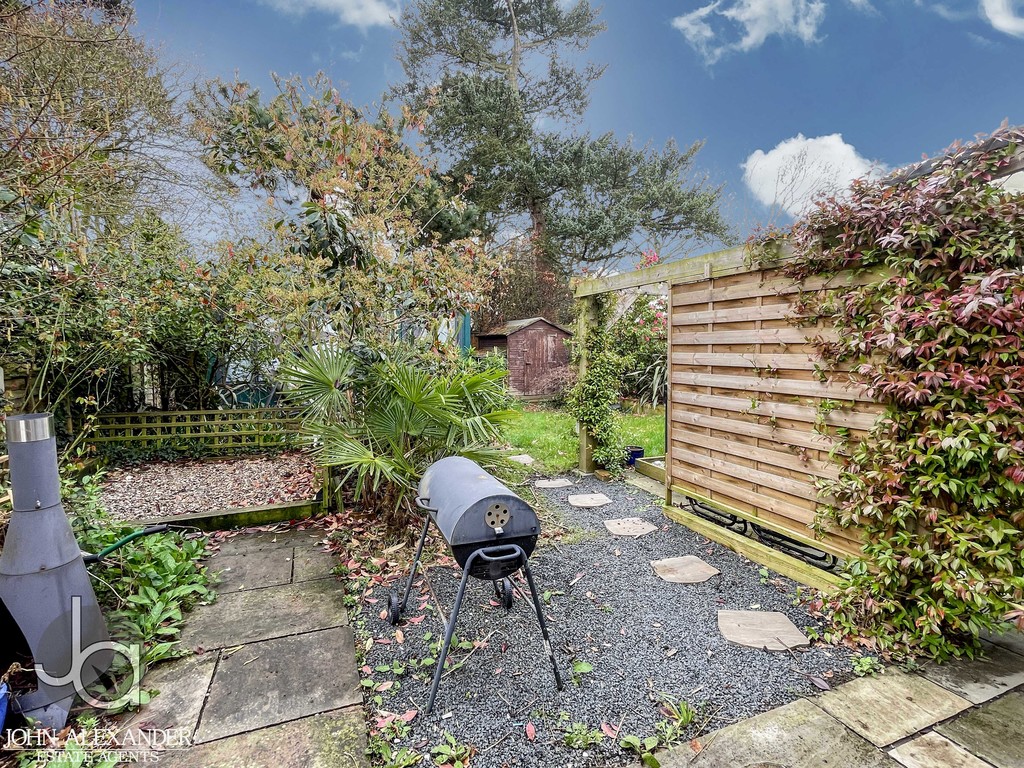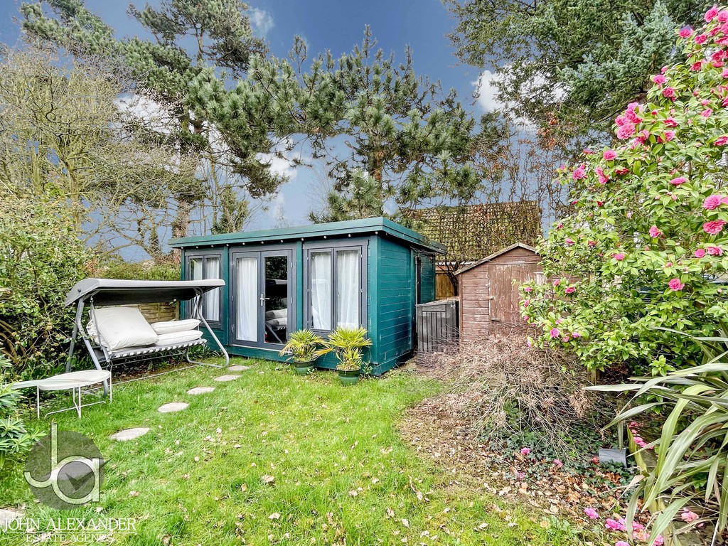 STEP OUTSIDE Outside, the south facing rear garden is a standout feature, beautifully landscaped with a mixture of mature and evergreen planting that provides colour and interest year round. A covered patio area sits just outside the dining room, offering the perfect spot for alfresco dining. There is practical exterior storage on both sides of the property. At the far end of the garden sits a superb 5m x 3m fully powered log cabin with air conditioning-ideal for use as a gym, studio, hobby room or additional relaxation space.