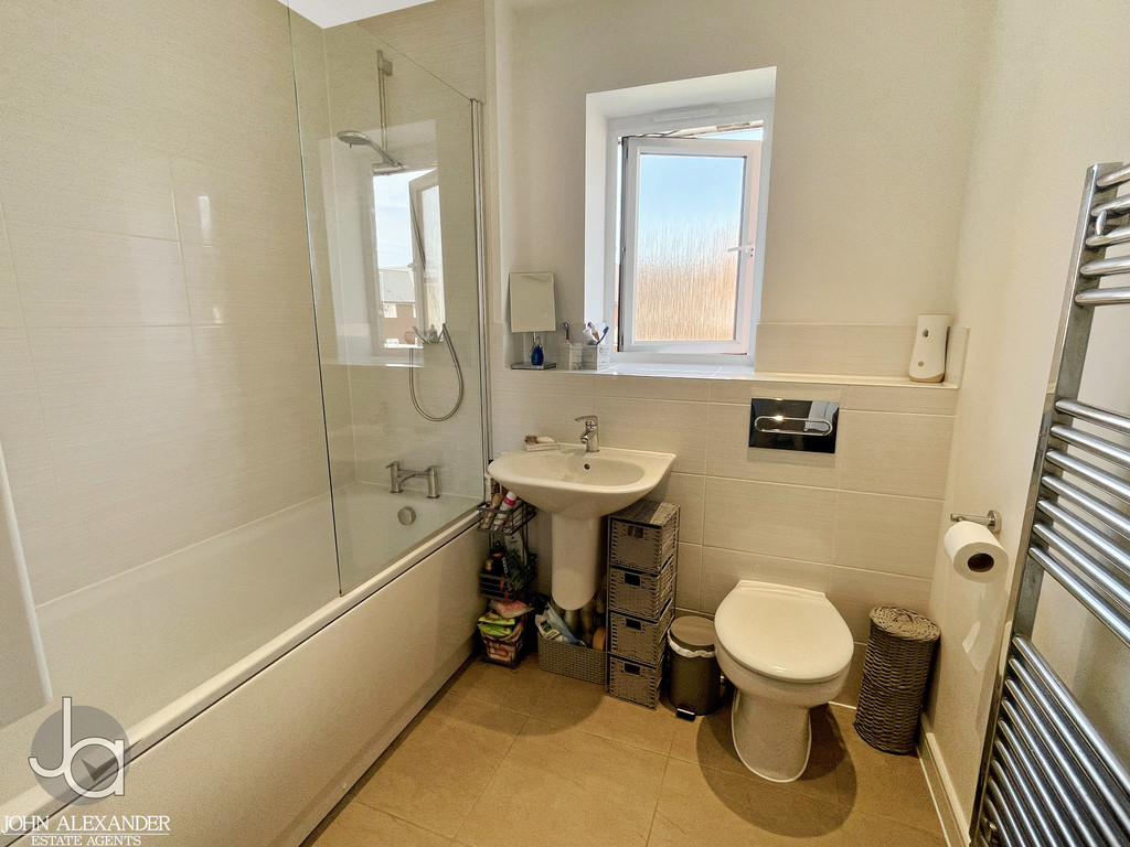 BATHROOM White suite comprising of panelled bath with shower above and guard, wash basin, low level WC, chrome heated rail, obscure double glazed window to rear.